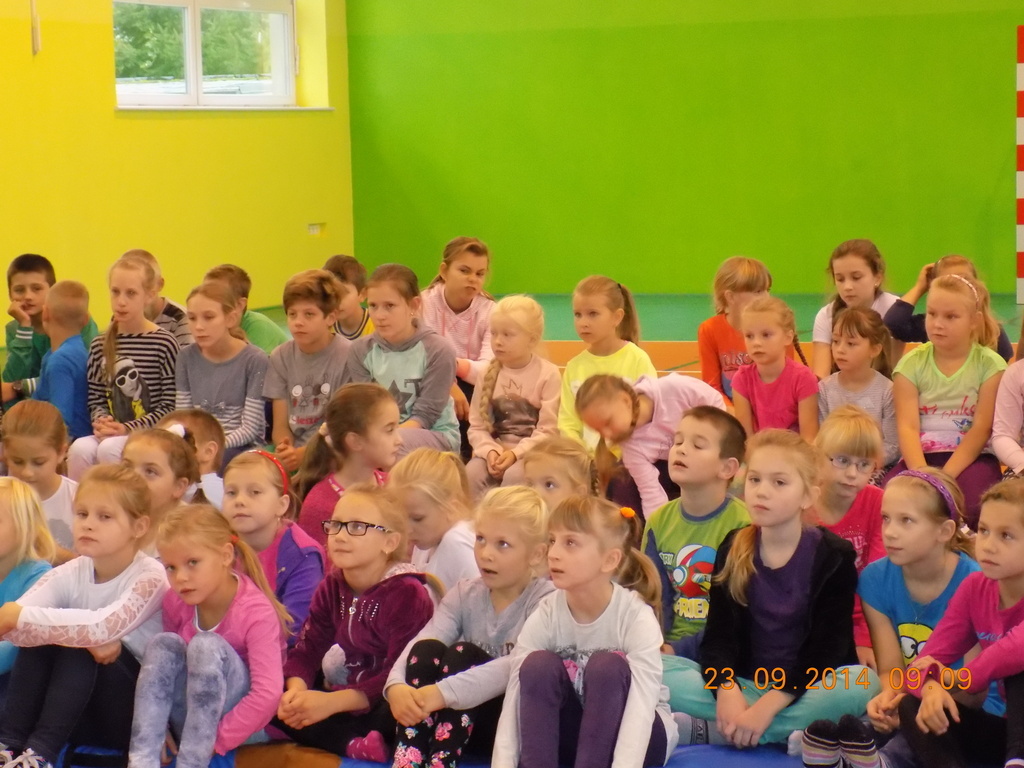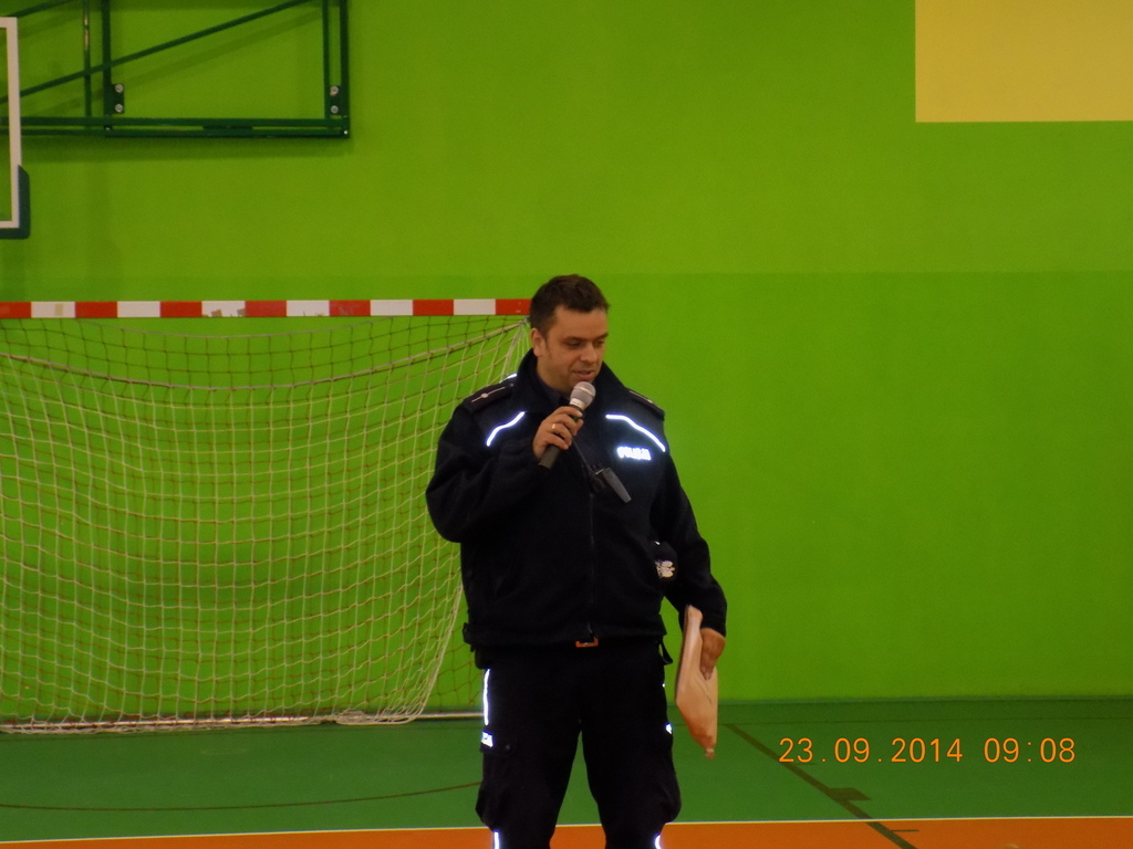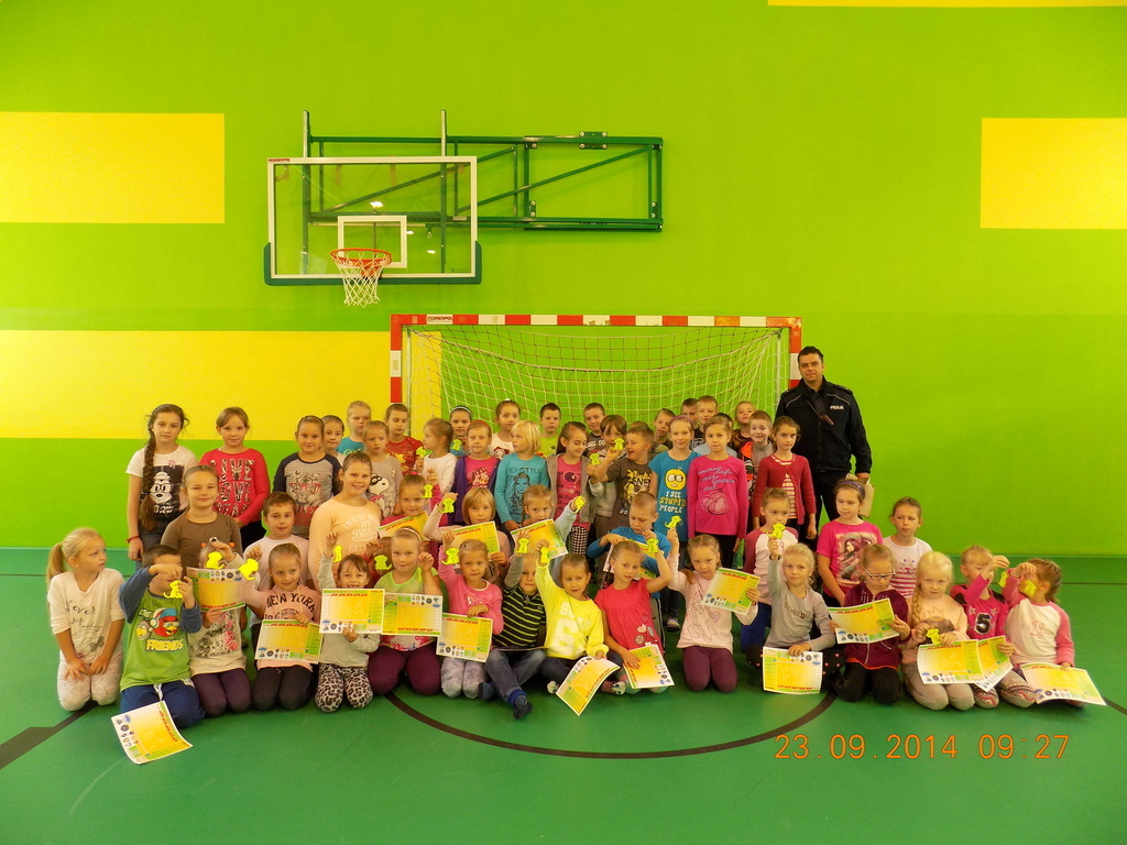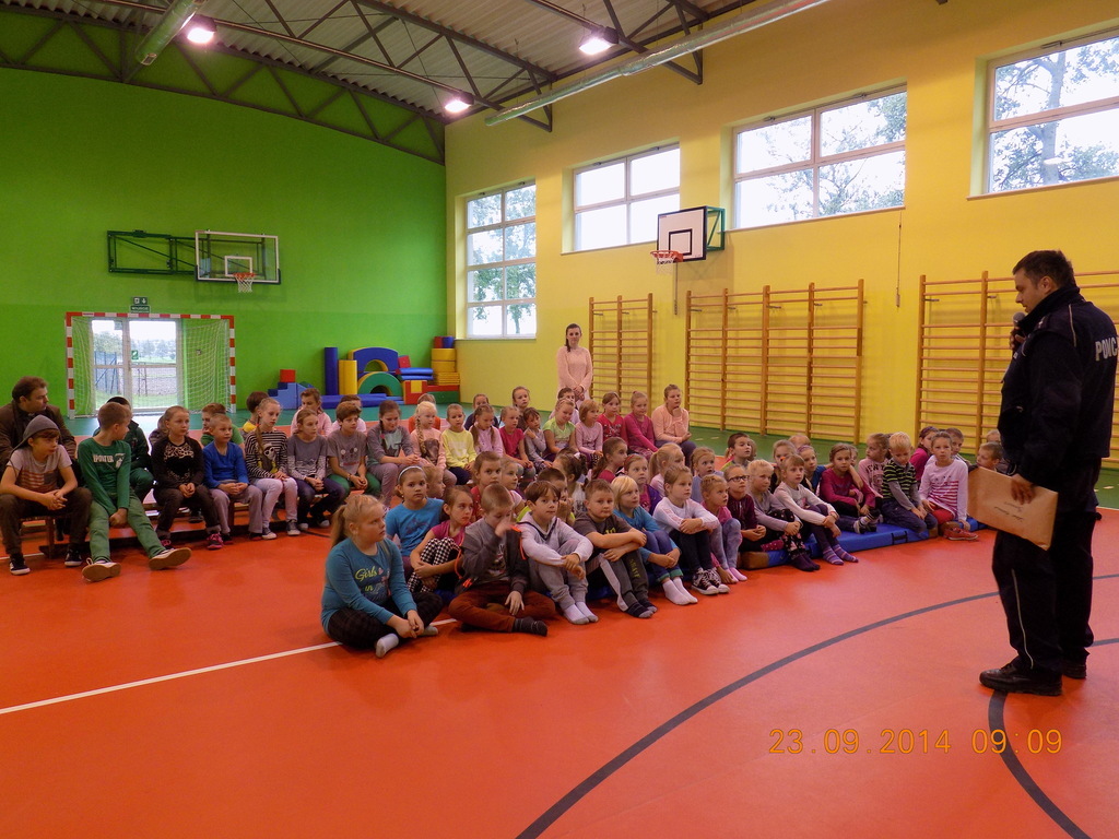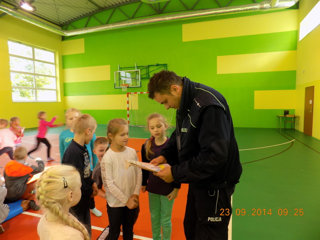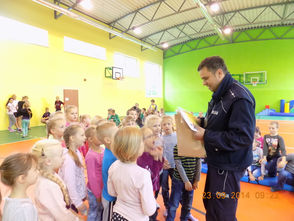 Dzieci z klas I-III oraz IV i V miały okazję 23 września porozmawiać z policjantem o zachowaniu bezpieczeństwa w drodze do i ze szkoły, o bezpiecznym przechodzeniu przez ulicę, prawidłowym zachowaniu się podczas jazdy rowerem. Nasz Gość zwrócił uwagę na niebezpieczeństwa, jakie mogą czyhać na dziecko na drodze, omówił sposoby unikania lub pokonywania ich. Pan policjant uczulił także uczniów, aby zawsze pamiętali o zapinaniu pasów podczas podróży samochodem. Ponadto podkreślił, jak ważną rolę pełnią elementy odblaskowe. Dzieci odpowiadały na zadawane pytania, wykazały się wiedzą z zakresu bezpieczeństwa w ruchu drogowym. Na koniec pierwszoklasiści otrzymali znaczki odblaskowe oraz plany lekcji.