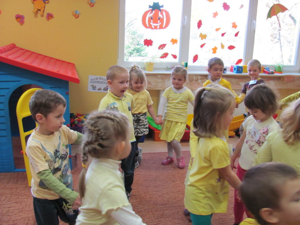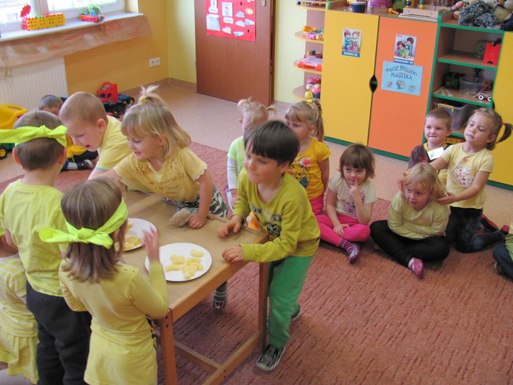 Przedszkolaki z grupy Misiaków (3-4 latki) poznają kolory, dlatego też co środę w przedszkolu przychodzą ubrane na określony wcześniej kolor. Dziś obchodziliśmy święto żółtego koloru. Przez cały dzień Misiaki świetnie bawiły się degustując żółte warzywa i owoce i odgadując ich nazwy, przedszkolaki szukały w sali przedmiotów, w których ukryła się żółta barwa, słuchały bajeczki o żółtej krainie oraz tańczyły do piosenek o żółtym słoneczku. Pani przeprowadziła eksperyment mieszania kolorów - dzieci przekonały się na własne oczy, że z połączenia np. barwy żółtej i niebieskiej powstaje zielona. Podsumowaniem zajęć były warsztaty plastyczne. Dzieci stworzyły słoneczka z żółtej bibuły i koła oraz wspólnie odtańczyliśmy kaczuchy.