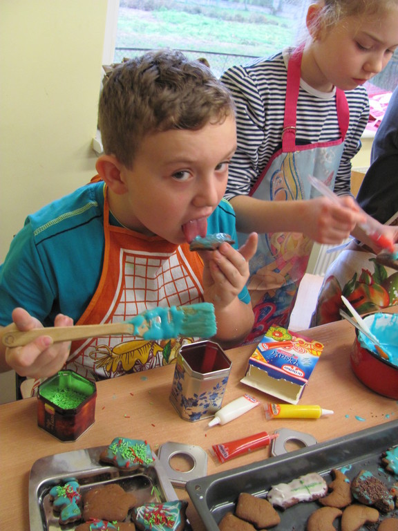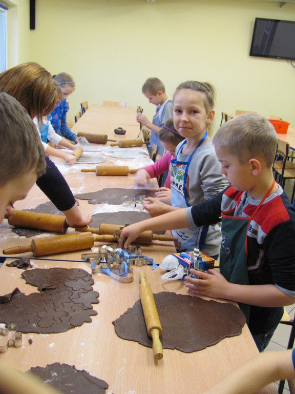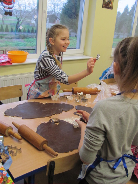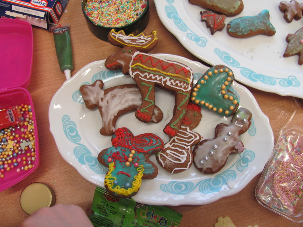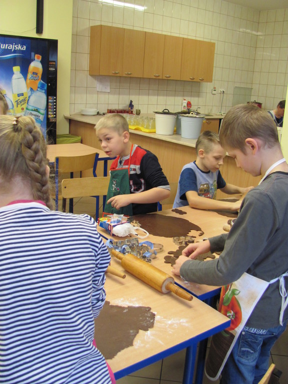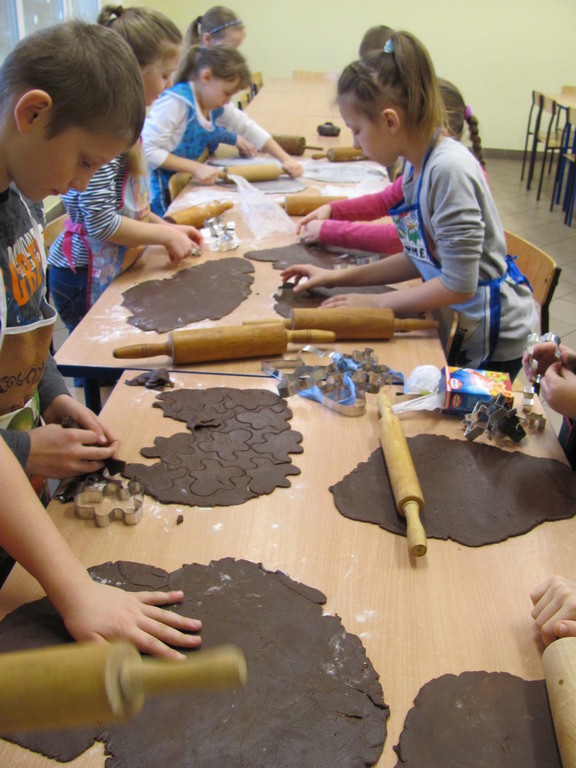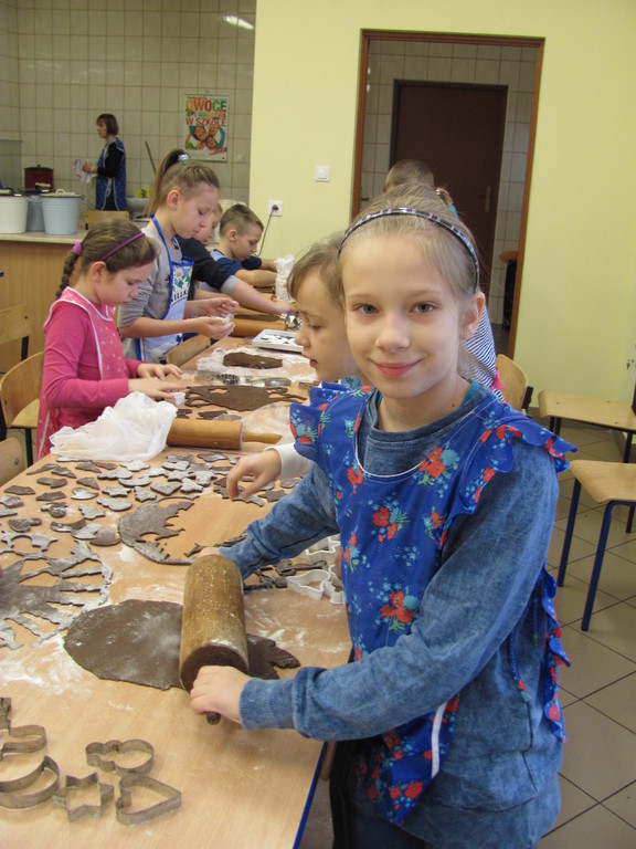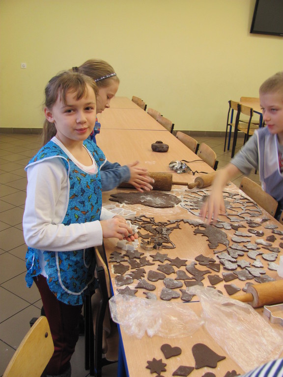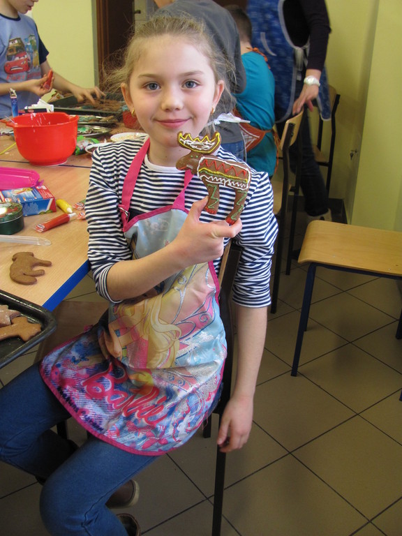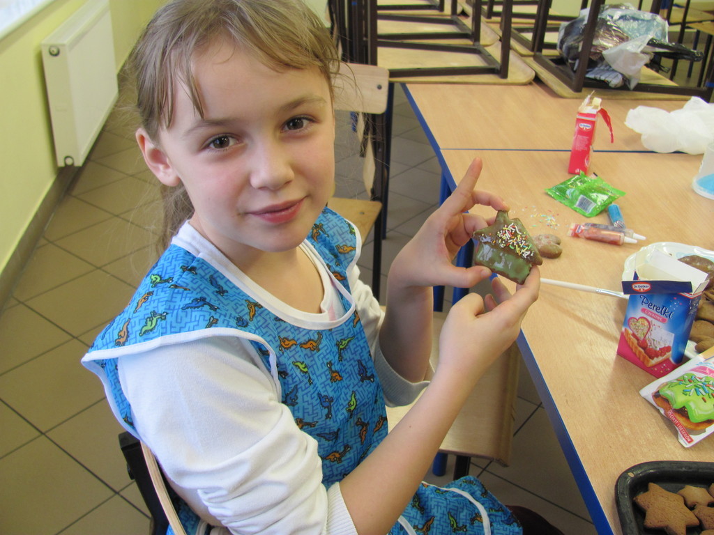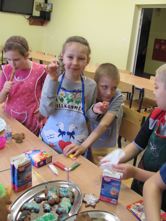 Dzisiaj piekliśmy pierniki. Trwało to dość długo. Do szkoły zaniosłam: wałek, posypkę, pisaki do ciasta, pędzelki do lukru i fartuch. Całe pieczenie prowadziła mama Dawida. Najpierw pani dała nam ciasto do rozwałkowania. Kiedy już je rozwałkowaliśmy zaczęliśmy foremkami wyciskać kształty pierników. Później układaliśmy je na blachy i wkładaliśmy do piekarnika. Gdy się już upiekły ładnie je udekorowaliśmy.