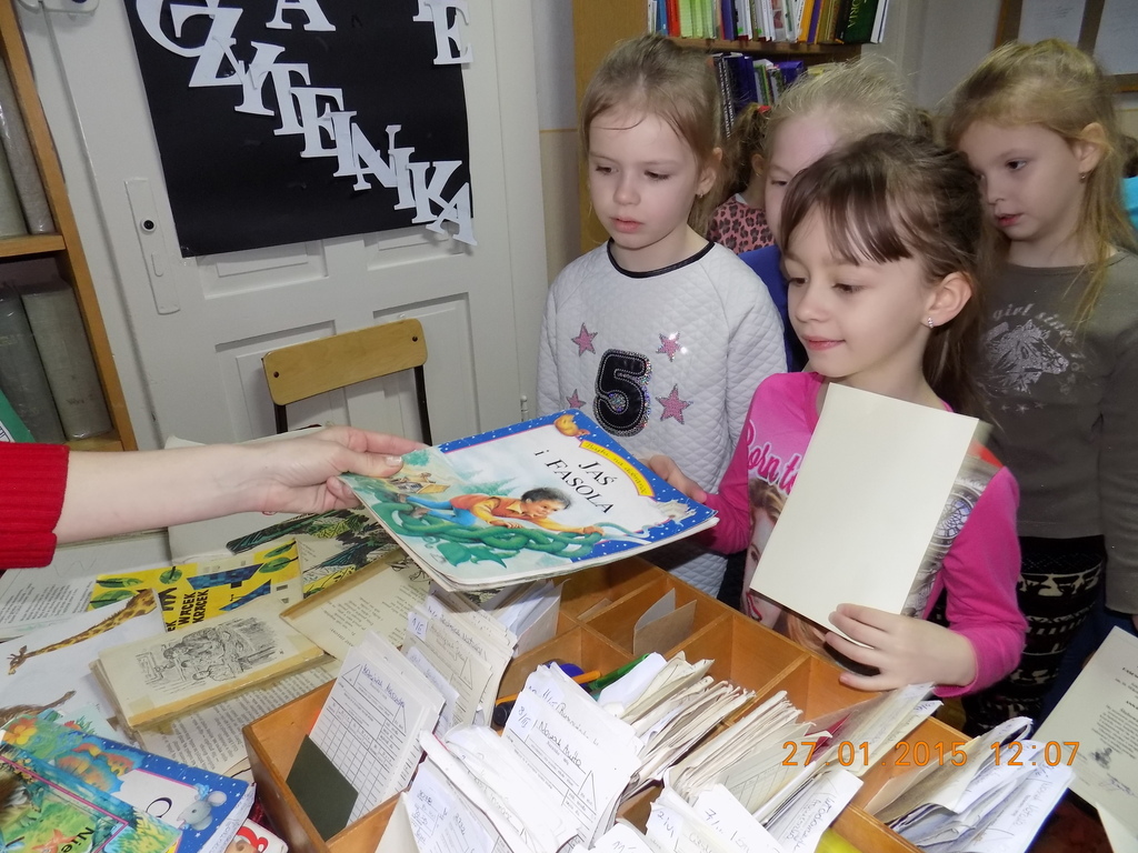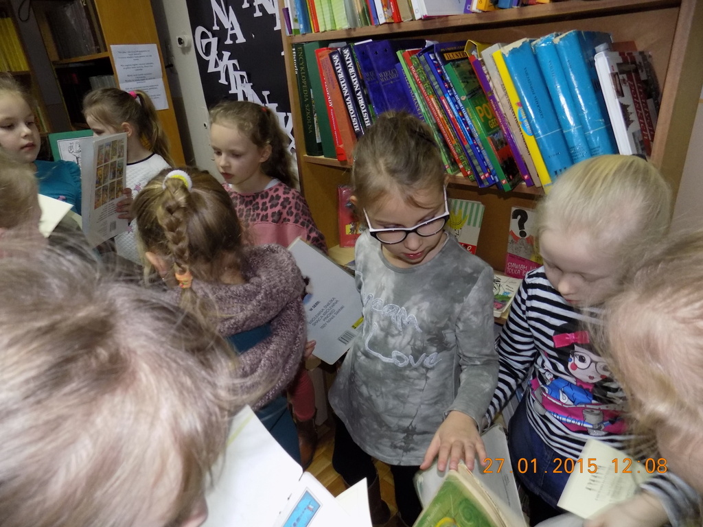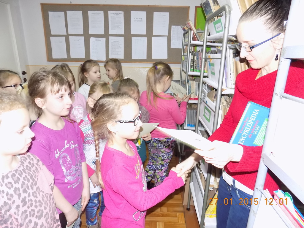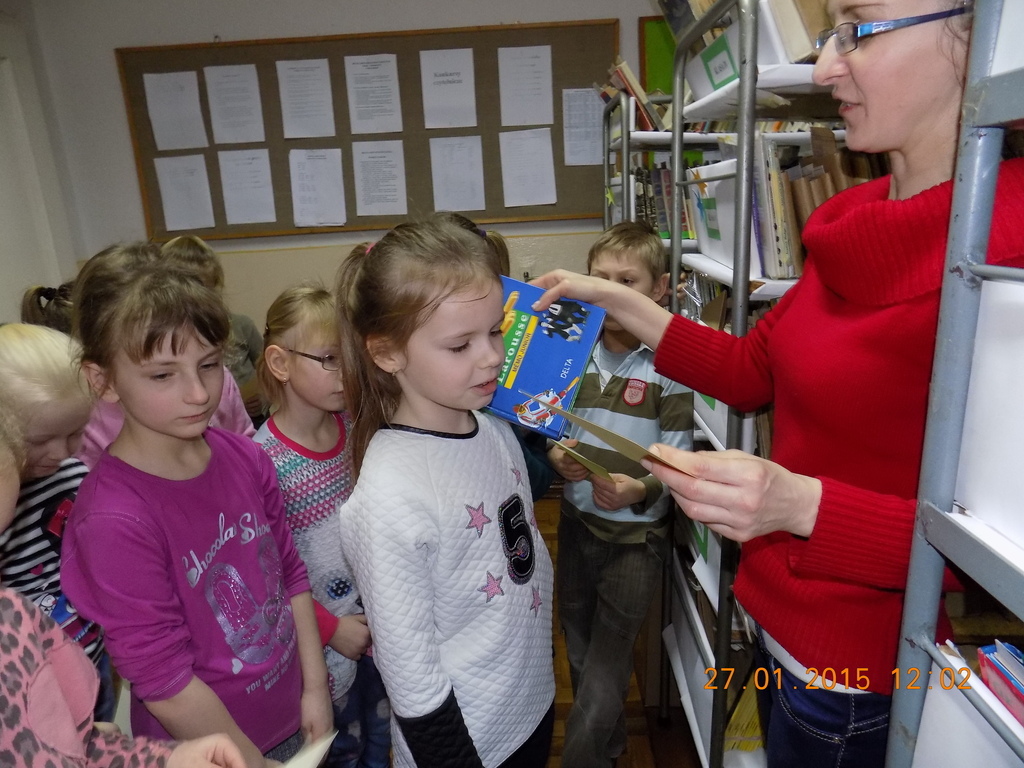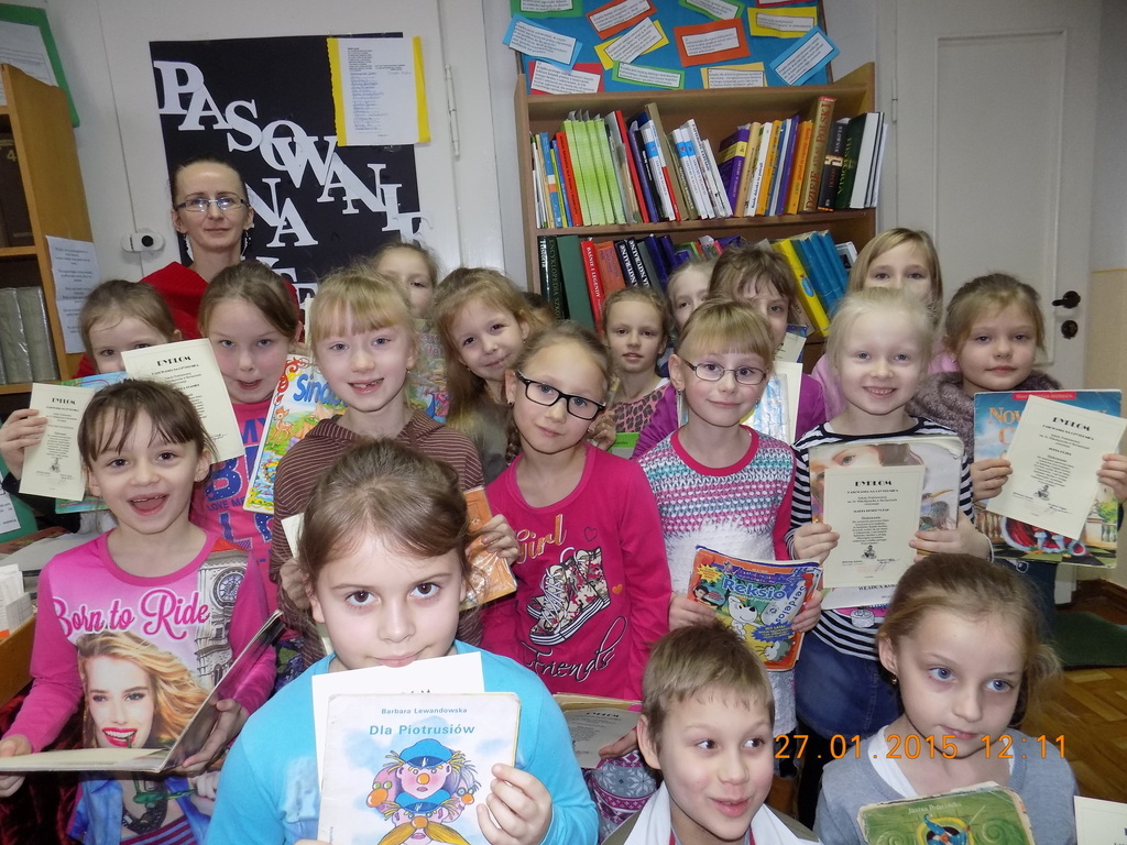Pierwszoklasiści znają już wiele liter, potrafią już nieźle czytać- nadeszła więc pora, by stali się czytelnikami szkolnej biblioteki. Pani Danka- szkolna bibliotekarka, z uśmiechem na twarzy przywitała zaciekawione dzieci. Najpierw opowiedziała o pracy bibliotekarza, o zgromadzonych książkach, przedstawiła regulamin wypożyczeń, a następnie dokonała uroczystego pasowania na czytelnika. Każdy pierwszoklasista z dumą wracał do klasy trzymając w dłoni pierwszą wypożyczoną książkę. Niektórzy zaczęli czytanie od razu, jeszcze w bibliotece. Oby tego zapału starczyło na długie lata!!!