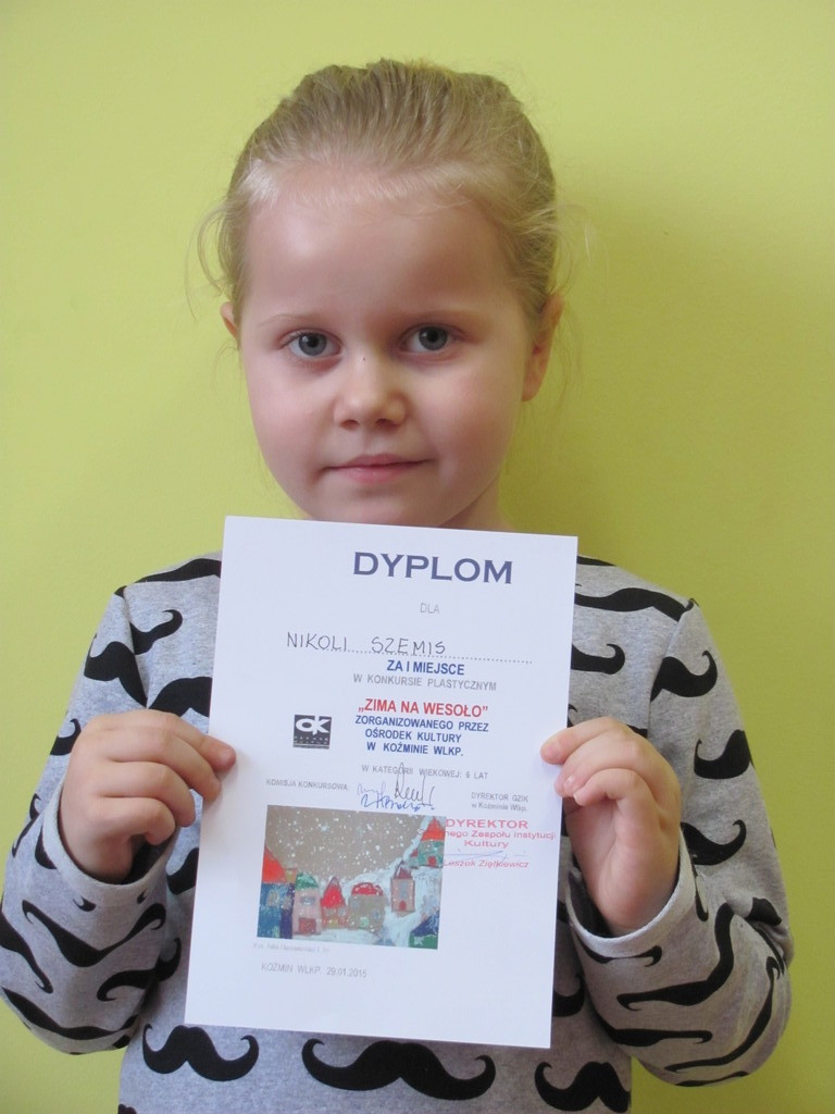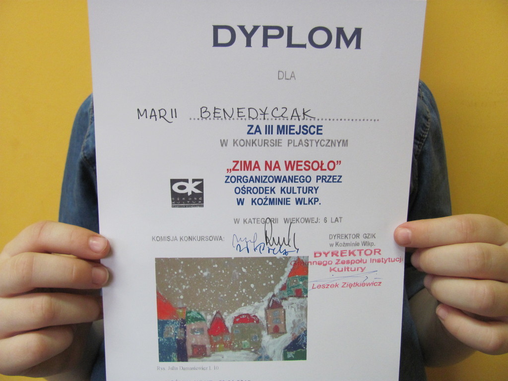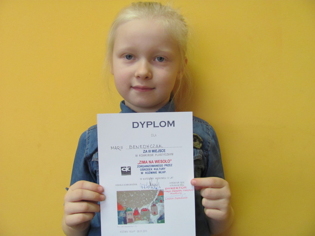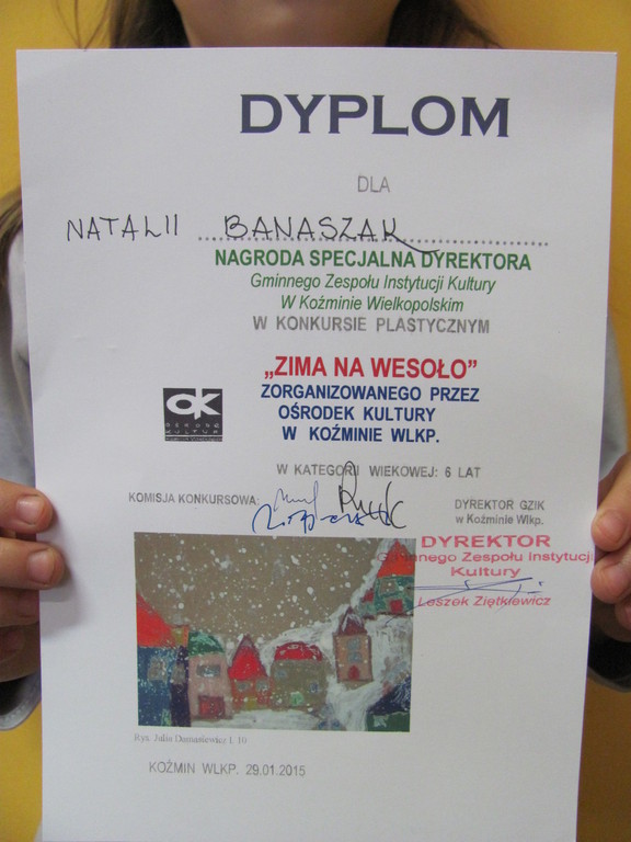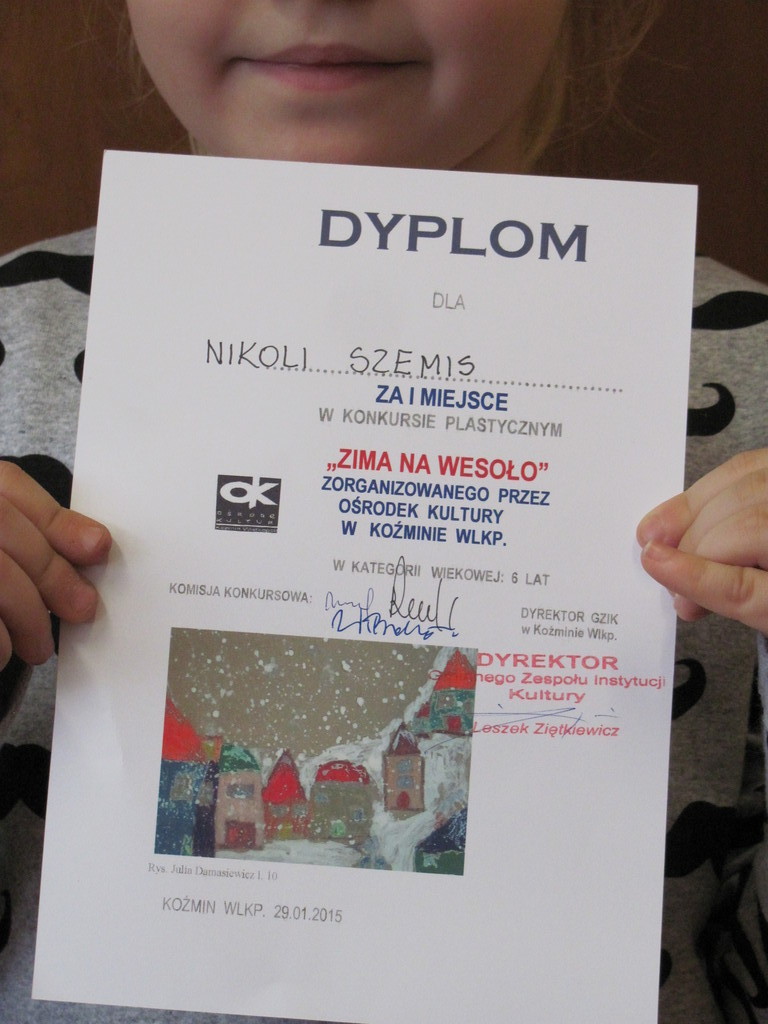 29 stycznia pięcioosobowa reprezentacja naszej szkoły udała się do ośrodka kultury w Koźminie Wlkp., by uczestniczyć w organizowanym tam konkursie plastycznym pod hasłem "Zima na wesoło". Maria Benedyczak, Natalia Banaszak i Wiktoria Maćkowiak z klasy I oraz Zuzanna Szymczak i Nikola Szemis z grupy przedszkolnej paluszkami malowały zimę.