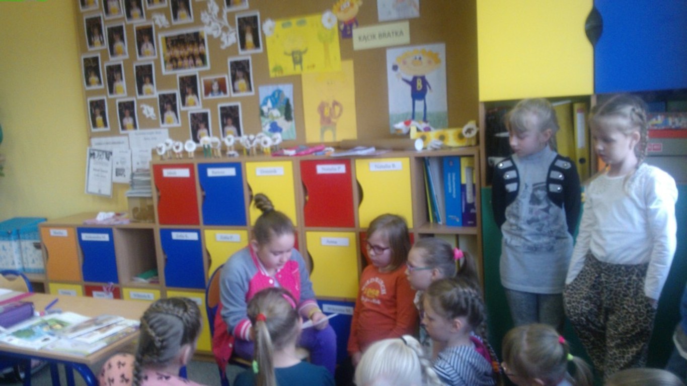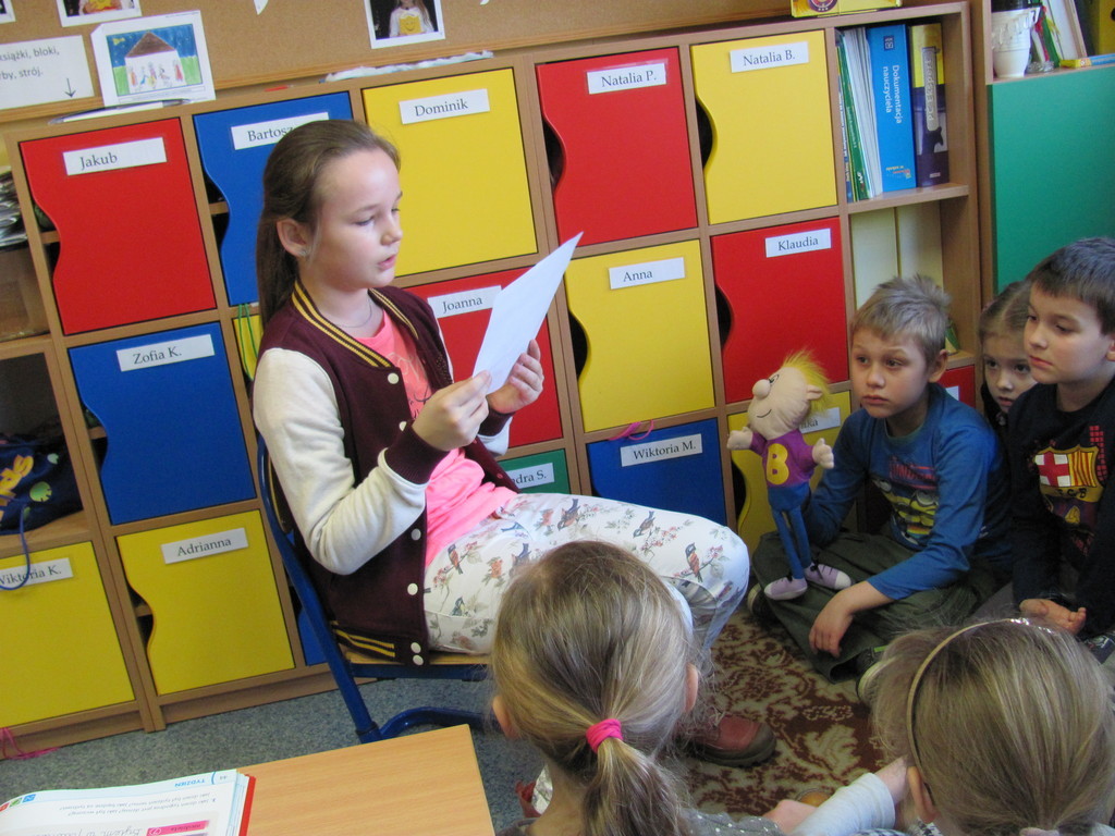 Klasa I zorganizowała w swojej klasie kącik czytelniczy "Poczytaj Bratkowi". Znalazł się w nim oczywiście główny bohater bajek i serii Ortograffiti, a przede wszystkim przyjaciel dzieci- Bratek. Do kącika zaprosiliśmy starsze koleżanki z klasy III i IV, które w każdy czwartek ochoczo czytały pierwszakom i Bratkowi.
