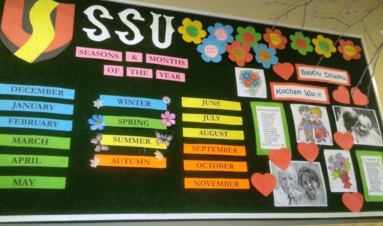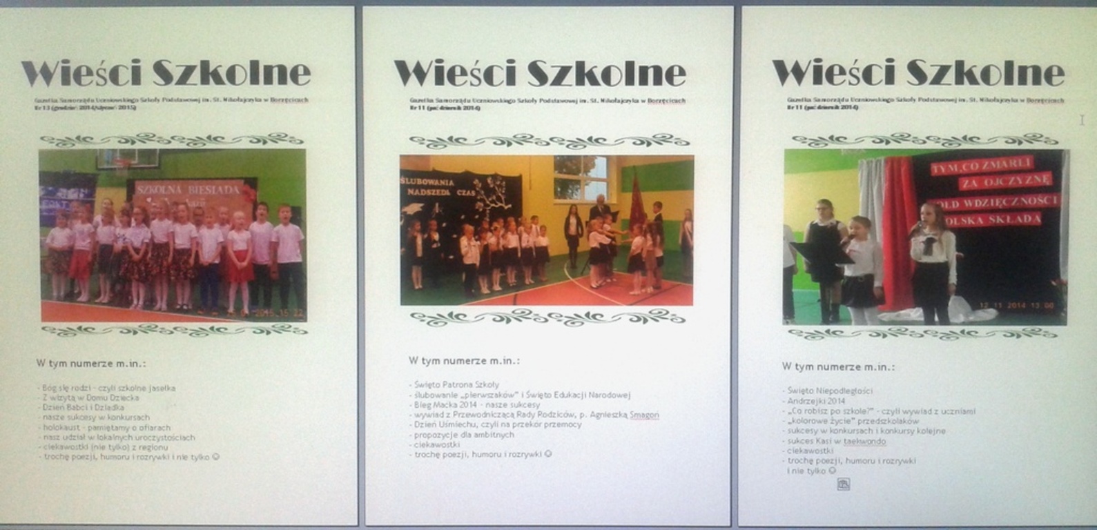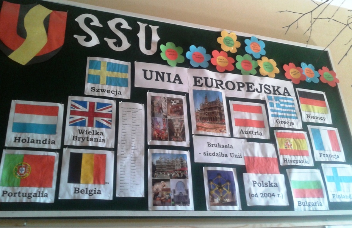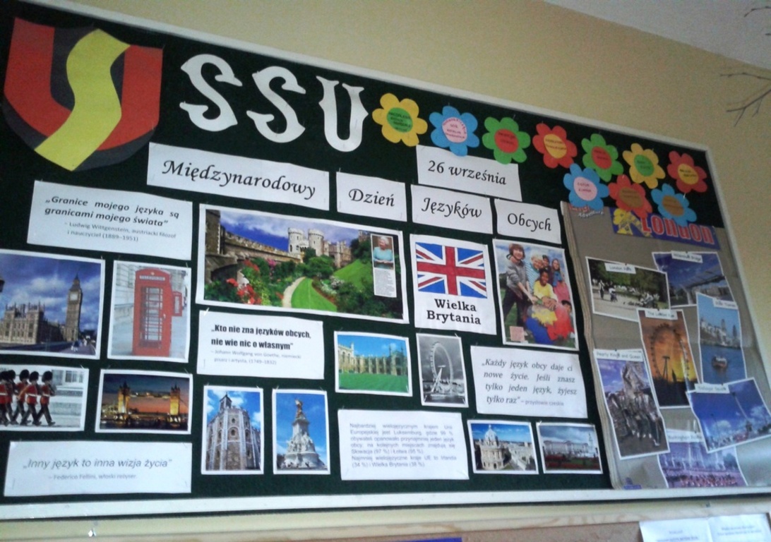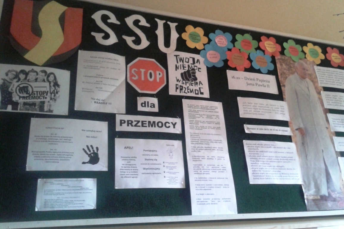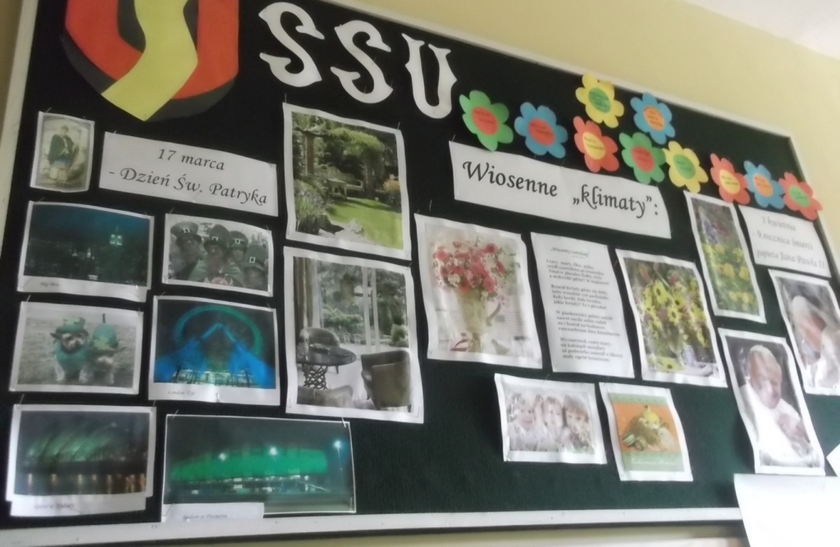 - przygotowanie oraz aktualizacja gazetki SU na szkolnym korytarzu(gazetka nawiązująca do wydarzeń z 1 września 1939 roku, gazetka dotycząca kultury krajów anglojęzycznych, gazetka nawiązująca do Święta Niepodległości, gazetka o tematyce świątecznej, gazetka „Stop dla przemocy”, gazetka o tematyce walentynkowej, gazetka nawiązująca do 1 Dnia wiosny, Dnia Św. Patryka, rocznicy śmierci Jana Pawła II, krajów Unii Europejskiej, wakacji) oraz informacje o konkursach i akcjach wywieszane na bieżąco.