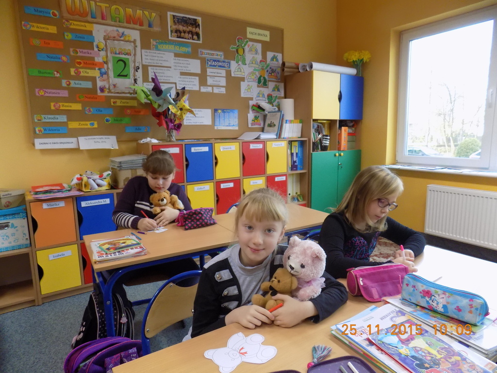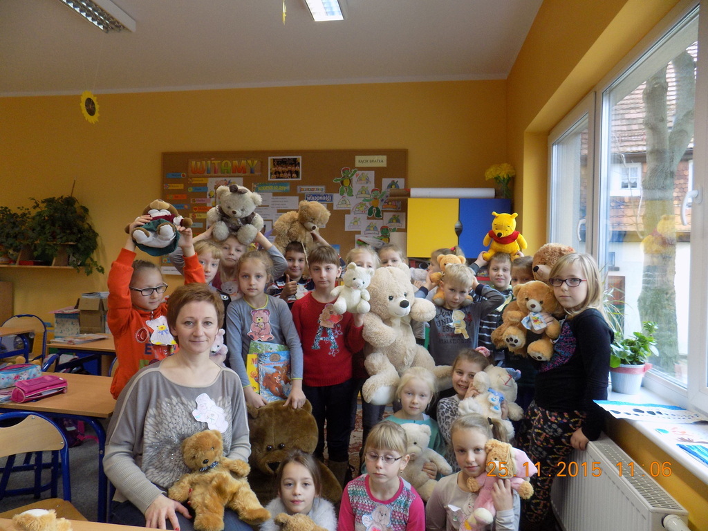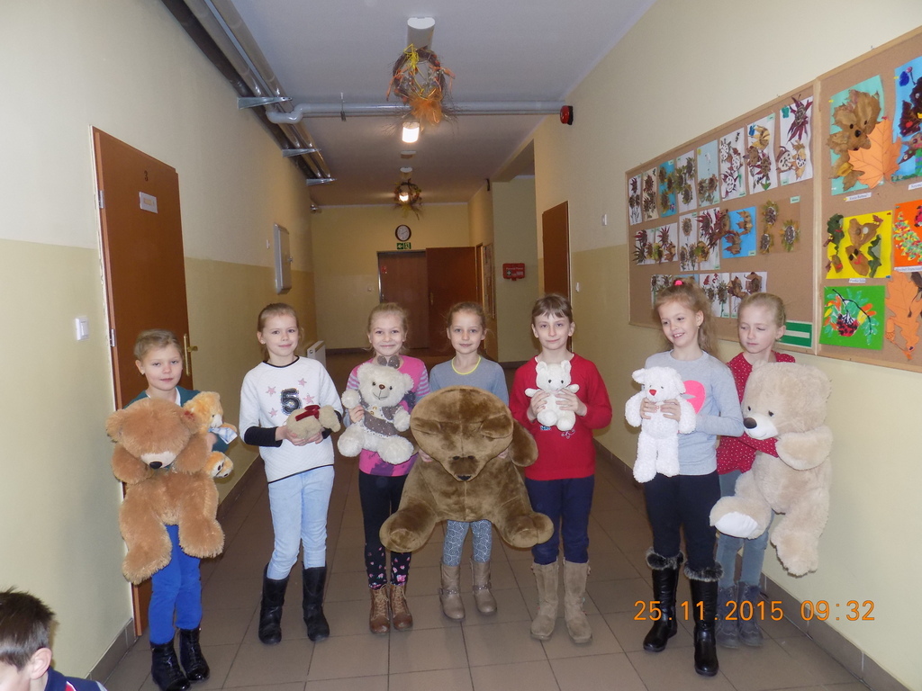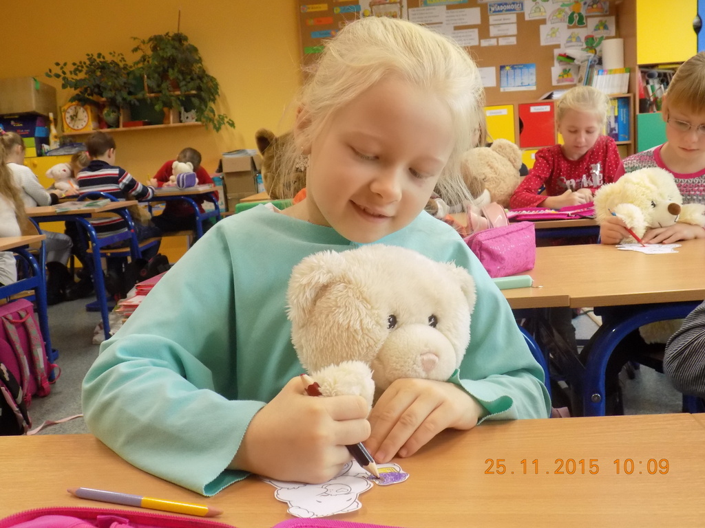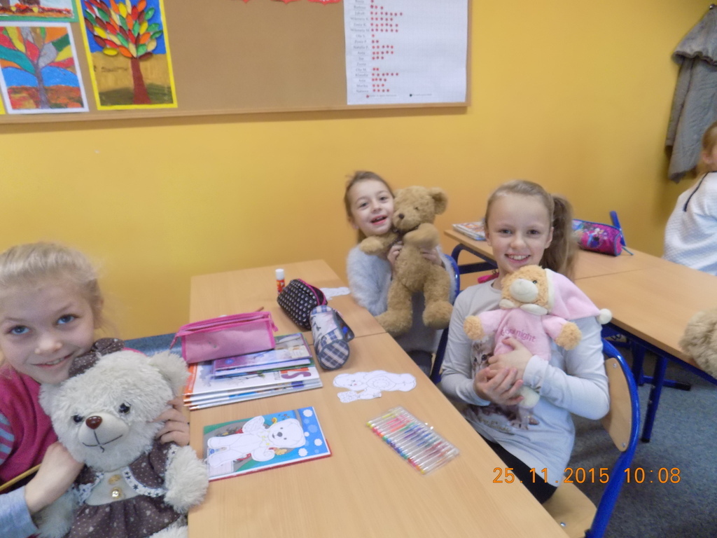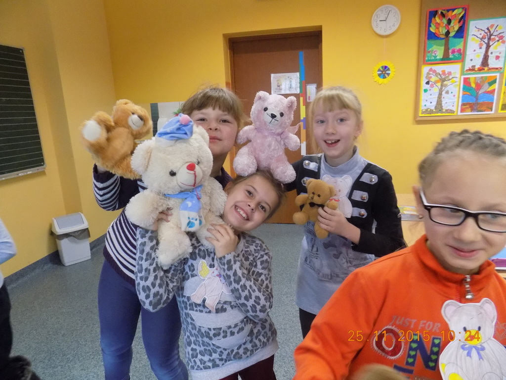 Tak rozpoczęła się w klasie II środa, 25 listopada, kiedy oprócz dzieci w ławkach zasiadły pluszowe misie przyniesione do szkoły z okazji Dnia Pluszowego Misia. Drugoklasiści poznali historię pluszowego misia, rozwiązywali zagadki związane z misiami, uzupełniali lubiane przez dzieci kolorowanki. Był też czas na taniec z pluszakiem. Nie mogło tego dnia zabraknąć czytania opowiadań o misiach z książek, które dzieci przyniosły do klasy z domowych biblioteczek.