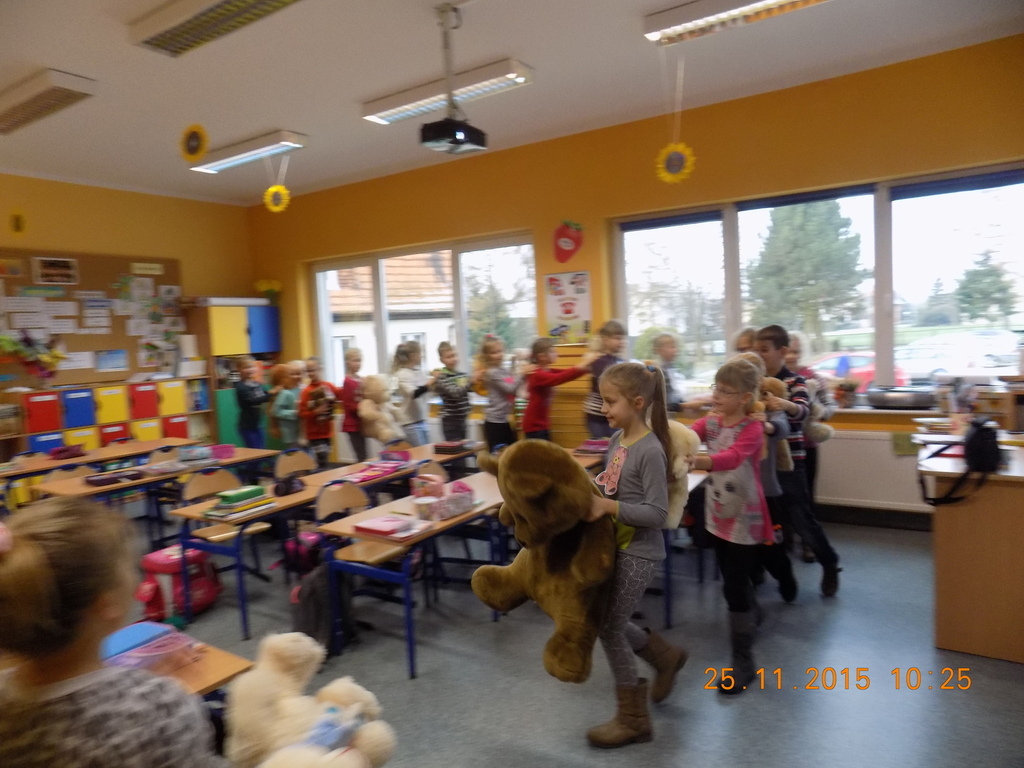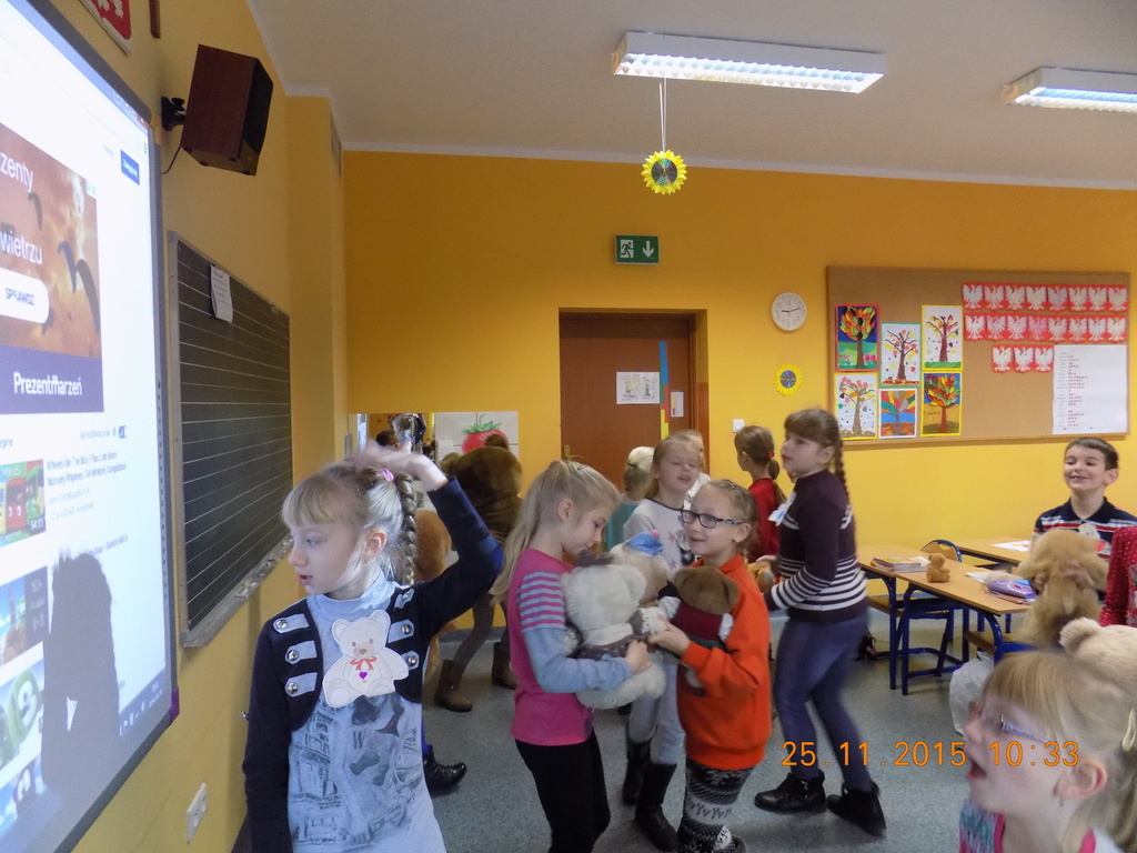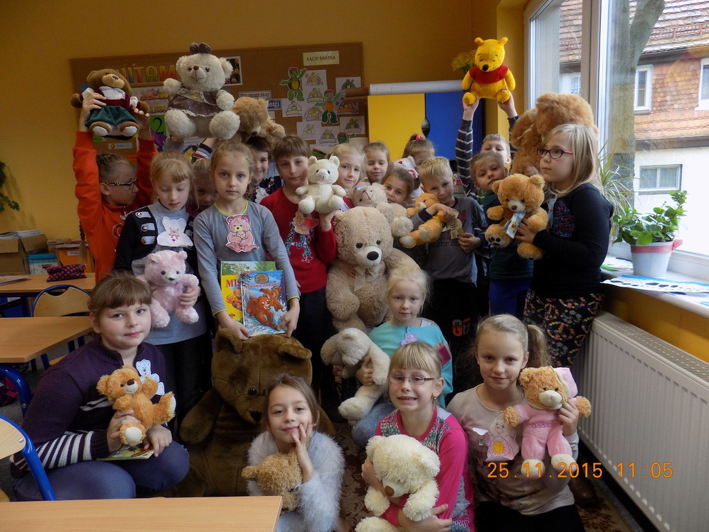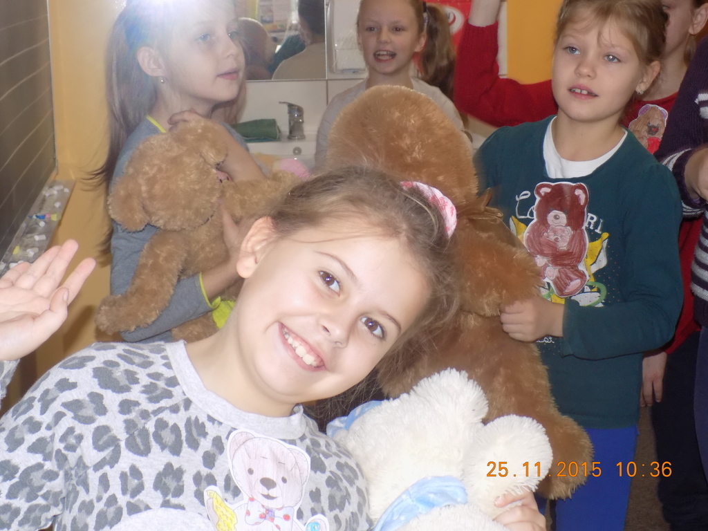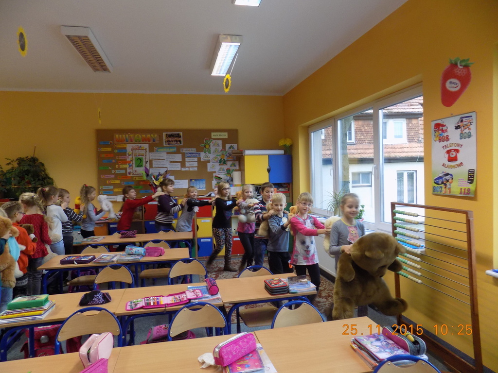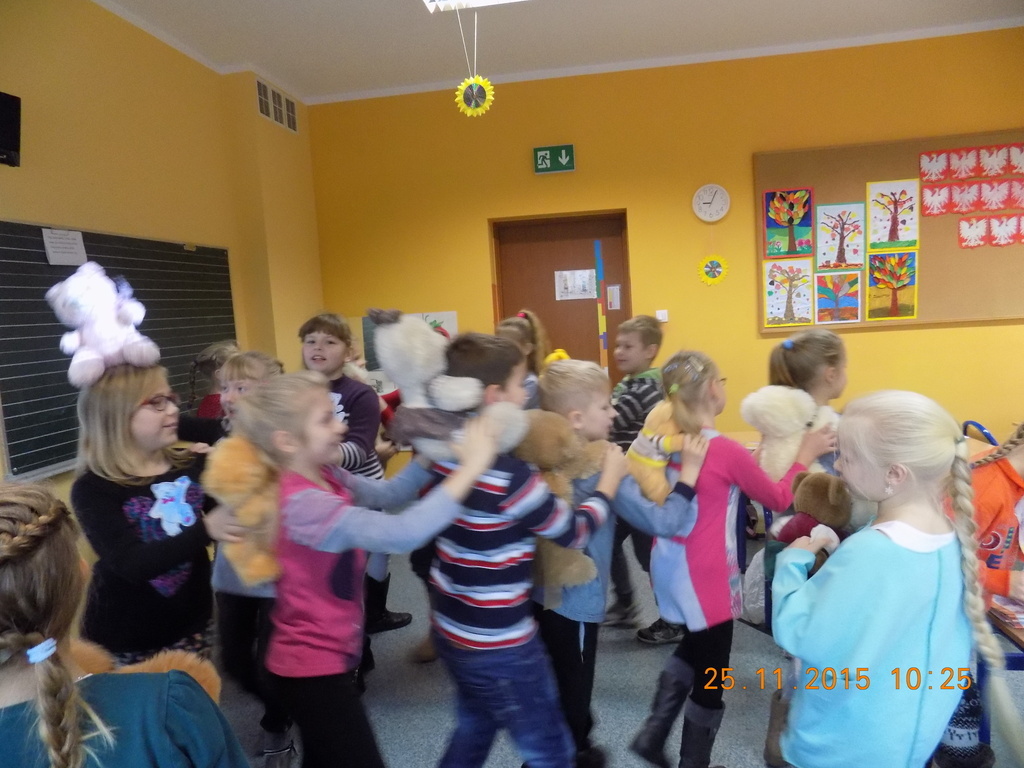 Tak rozpoczęła się w klasie II środa, 25 listopada, kiedy oprócz dzieci w ławkach zasiadły pluszowe misie przyniesione do szkoły z okazji Dnia Pluszowego Misia. Drugoklasiści poznali historię pluszowego misia, rozwiązywali zagadki związane z misiami, uzupełniali lubiane przez dzieci kolorowanki. Był też czas na taniec z pluszakiem. Nie mogło tego dnia zabraknąć czytania opowiadań o misiach z książek, które dzieci przyniosły do klasy z domowych biblioteczek.