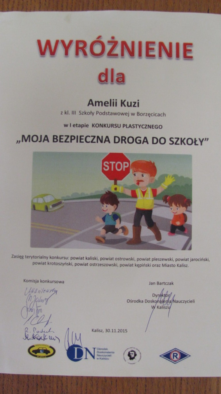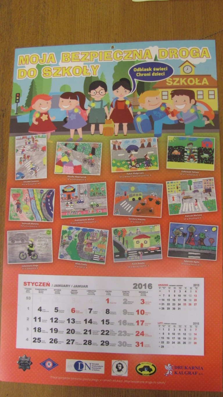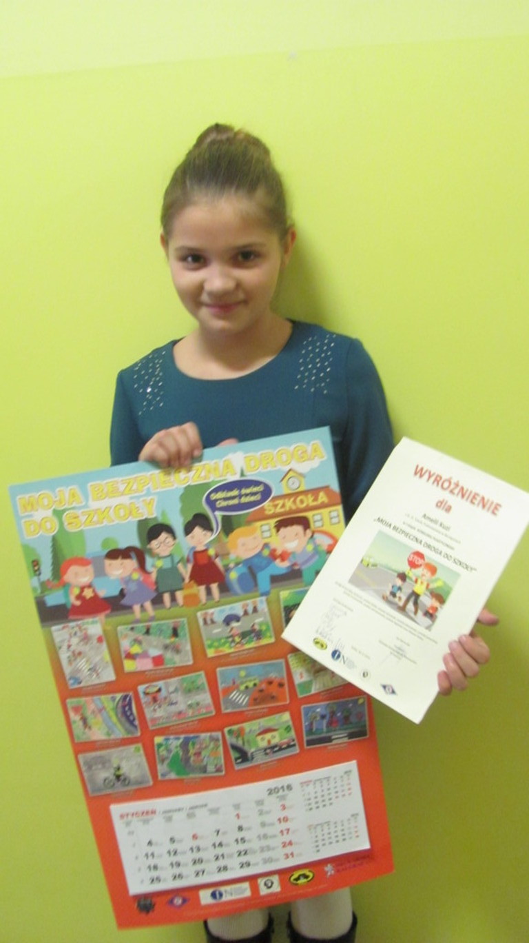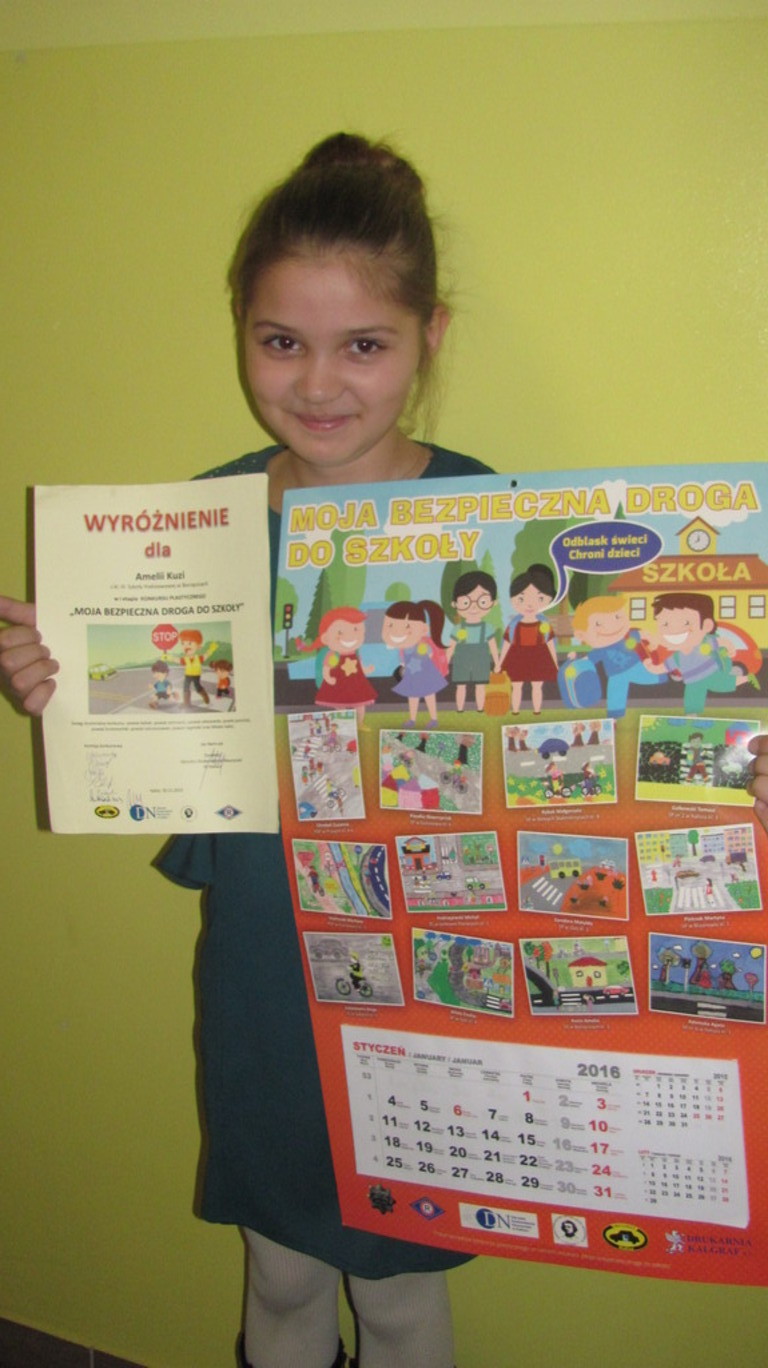 30 listopada w Kaliszu odbył się II etap konkursu plastycznego pt. "Moja bezpieczna droga do szkoły" do którego z naszej szkoły zostały zakwalifikowane dwie uczennice - Rozalia Stencel (klasa V) i Amelia Kuzia (klasa V). Ogromny sukces odniosła praca Amelii, która otrzymała wyróżnienie. Jej praca została umieszczona na kalendarzu, który został wydrukowany w 1000-egzemplarzy i trafił do wszystkich okolicznych szkół, które brały udział w tym konkursie.