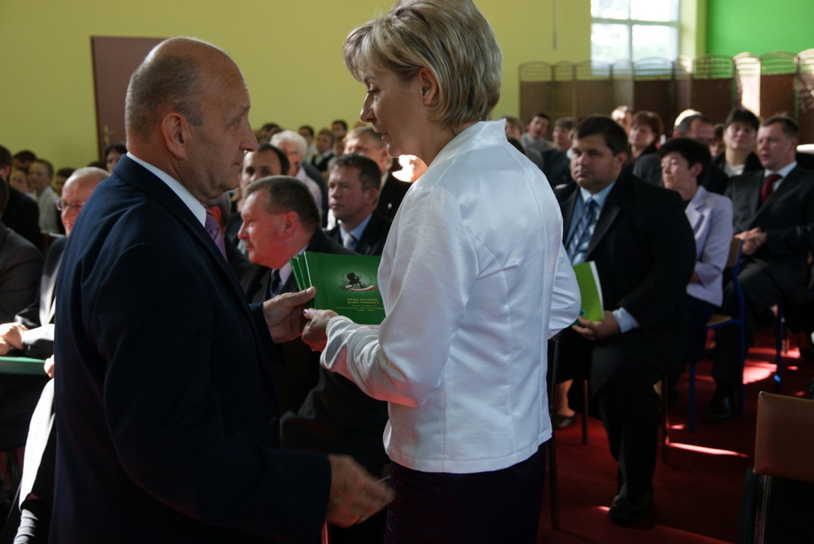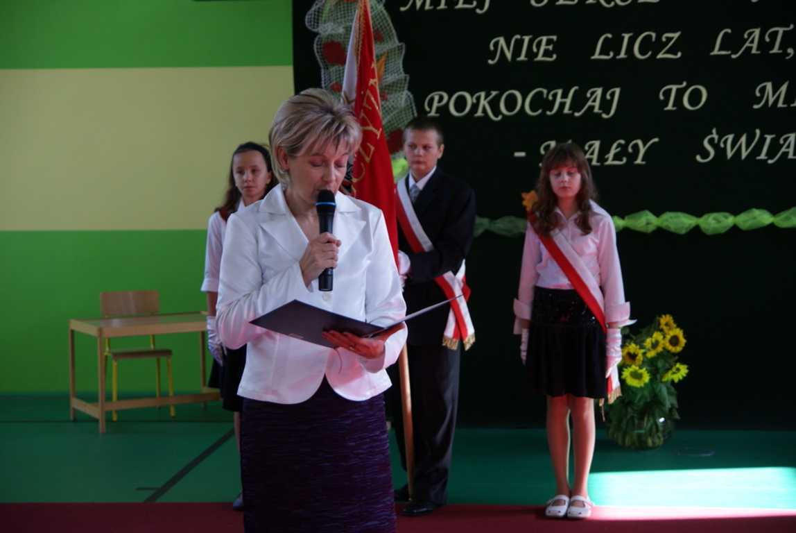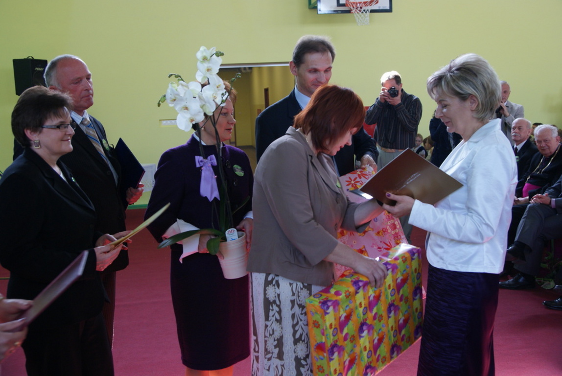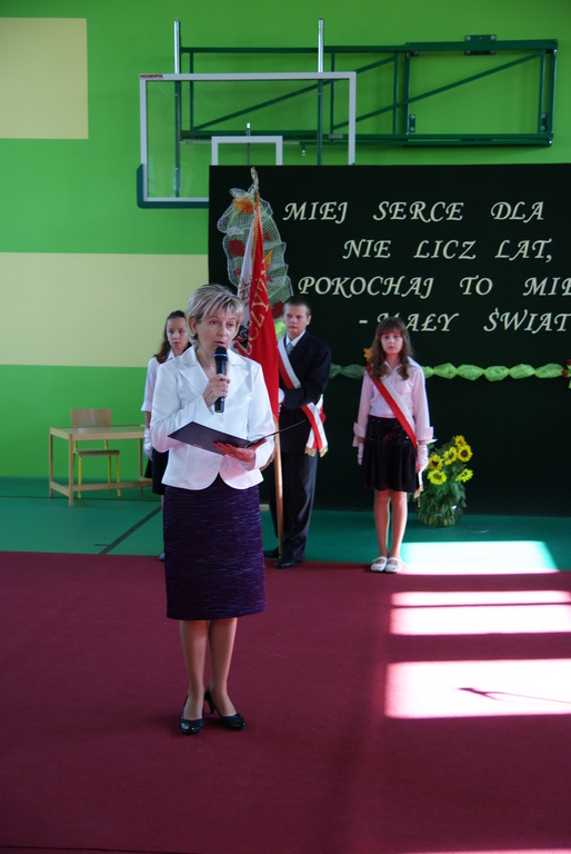 ks. kanonik Stanisław Wnuk. W swoim wystąpieniu pani dyrektor powiedziała: „Dzisiejszy dzień jest szczególnie ważny w dziejach naszej szkoły, ponieważ wyczekiwany przez lata. Dokonaliśmy uroczystego otwarcia obiektu, który będzie służył nam i przyszłym pokoleniom. Od 1 września zajęcia dla przedszkolaków i klas I-III odbywają się w nowych, pachnących świeżością salach. Do dyspozycji wszystkich uczniów mamy salę gimnastyczną, która kiedyś była tylko marzeniem. Marzeniem, które zostało spełnione. A więc warto marzyć…”