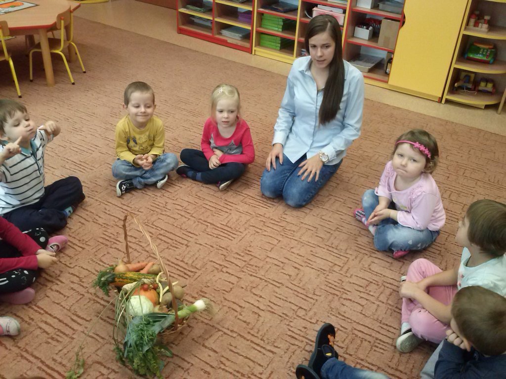 Przedszkolaki z grupy 3,4 latki odwiedził kosz pełen warzyw. Dzieci poprzez dotyk i zapach poznały dary ogrodu. Następnie wykorzystały tę wiedzę podczas zabawy. Zadaniem dzieci było odgadnięcie za pomocą zmysłu dotyku i węchu jakie warzywo znajduje się w magicznym pudełku. Przedszkolaki poznały sposoby przechowywania zapasów na zimę. Na zakończenie zajęć dzieci wykonały pracę plastyczną- „Kiszone ogórki w słoiku.”