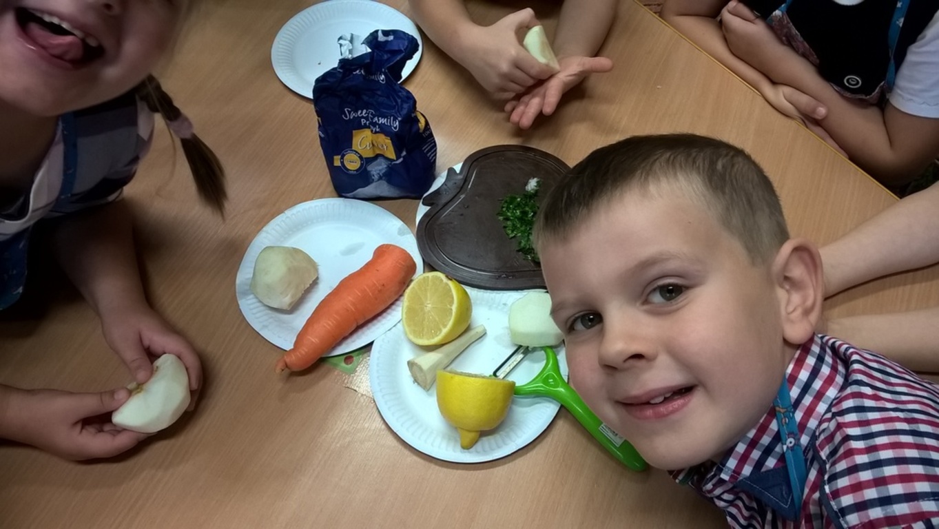 Przedszkolacy z grupy 5-latków doskonale wiedzą jak ważne jest zdrowe odżywianie. Z przyniesionych do przedszkola warzyw i owoców postanowiliśmy zrobić pyszną i bardzo zdrową surówkę. „Misiaki” pamiętały o zachowaniu higieny podczas pracy oraz zasad bezpieczeństwa podczas ścierania warzyw na tarce. Okazuje się, że dzieci uwielbiają zajęcia kulinarne w przedszkolu – dlatego wkrótce zrobimy sałatkę warzywną – mniam!