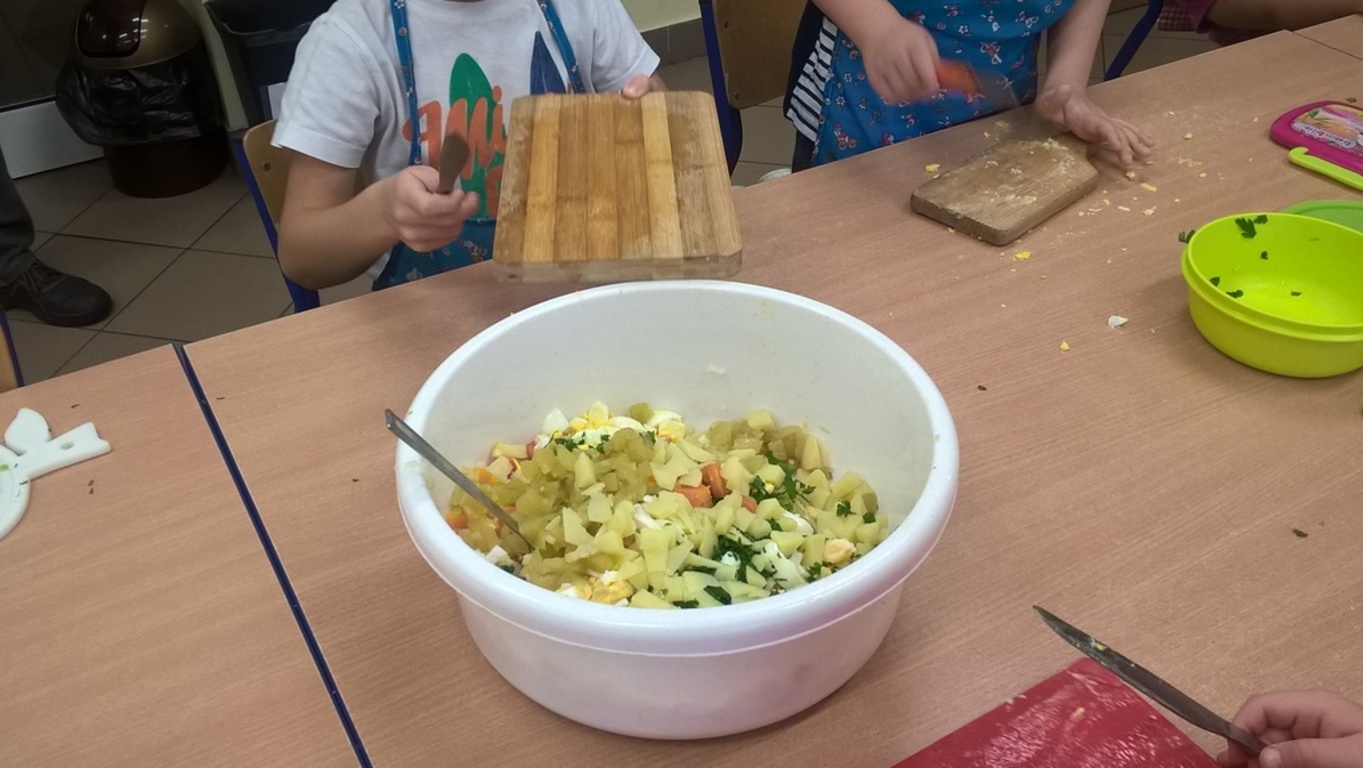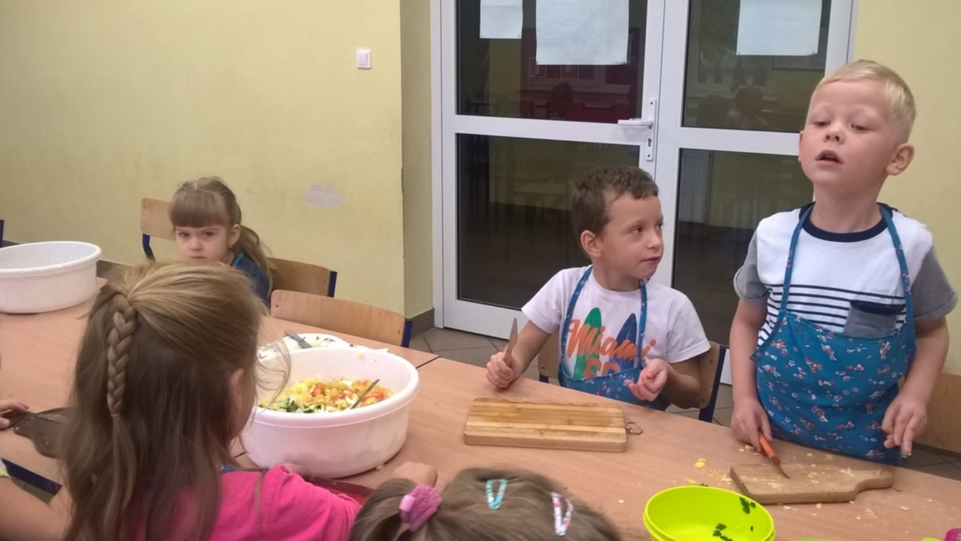 Październik jest w naszym przedszkolu witaminowym miesiącem, dlatego tez uczymy się co jeść by być zdrowym i silnym. Podczas zajęć poznawaliśmy owoce i warzywa nie tylko za pomocą wzroku, ale również innymi zmysłami: węchem, dotykiem i smakiem. Zwieńczeniem naszych działań były „zajęcia kulinarne” podczas których wykonaliśmy już surówkę, a teraz przyszedł czas na sałatkę jarzynową. Popatrzcie jak to było.