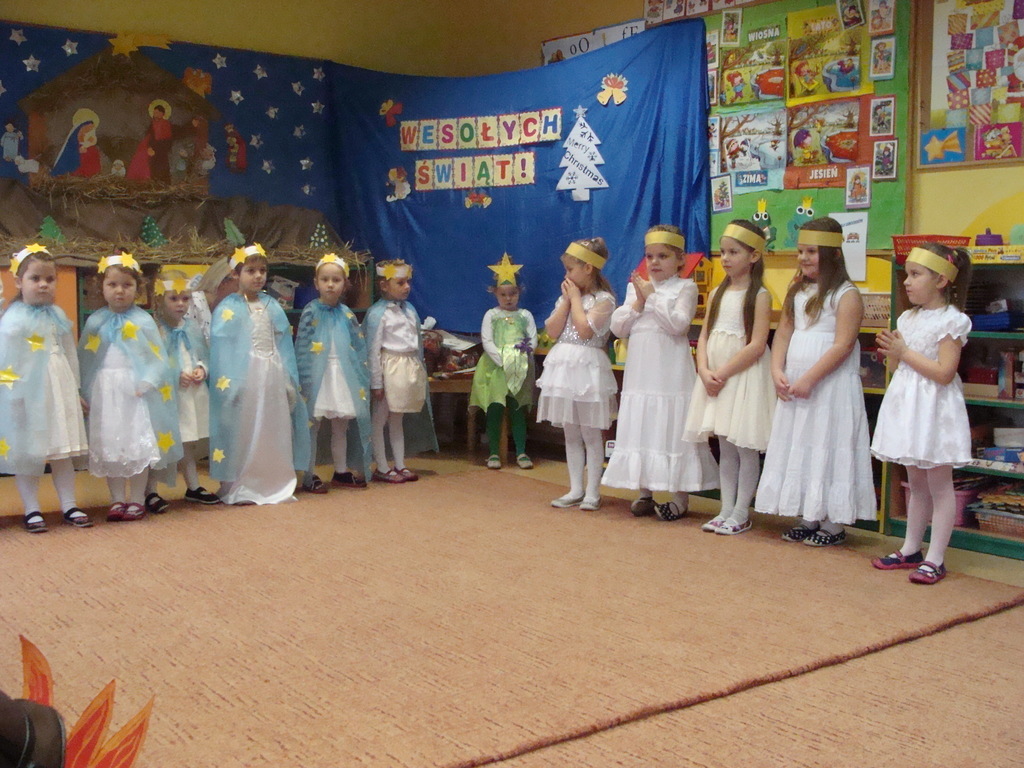 Jak co roku przedszkolaki przygotowały dla swoich kochanych rodziców przedstawienie jasełkowe, by wprowadzić wszystkich w świąteczny bożonarodzeniowy nastrój. Sala przedszkolna 5-latków zamieniła się w stajenkę, a dzieci- mali aktorzy w aniołów, gwiazdeczki, królów, pasterzy, nie mogło zabraknąć oczywiście Maryi i Św. Józefa, na scenie pojawiła się też choineczka. Dzieci nie tylko pięknie recytowały wiersze i śpiewały polskie kolędy, ale także tańczyły. Wspaniały taniec gwiazdeczek oraz układ taneczny aniołów do pastorałki „Weseli anieli” urozmaicił przedstawienie i wywołał uśmiech wśród zaproszonych gości.