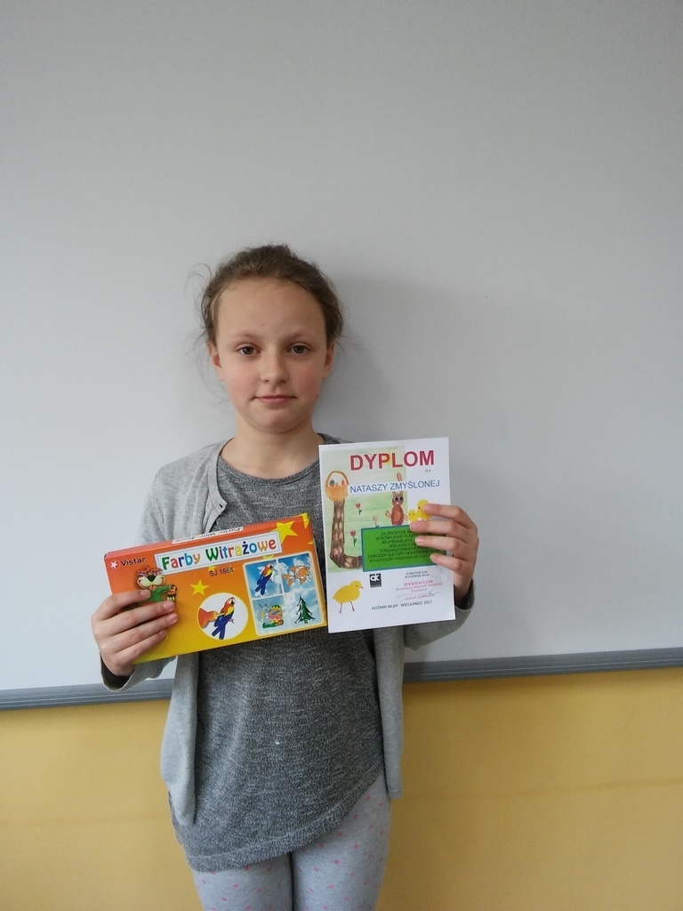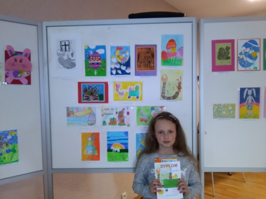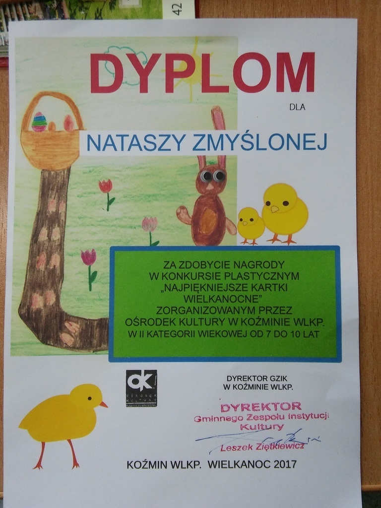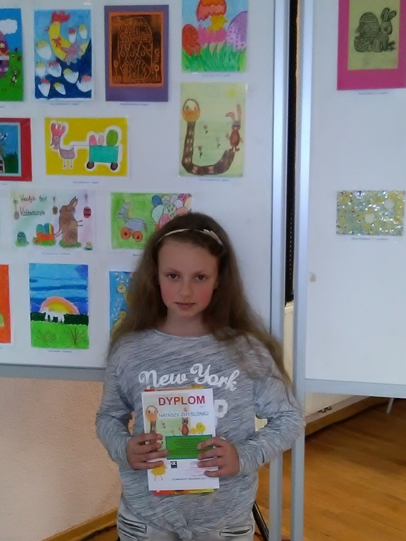 Nasza uczennica z klasy III- Natasza Zmyślona znalazła się jako jedyna z naszej szkoły, w gronie osób nagrodzonych w konkursie plastycznym organizowanym przez Gminny Zespół Instytucji Kultury w Koźminie Wielkopolskim. 20 kwietnia w koźmińskim ośrodku kultury odebrała nagrodę i dyplom za przygotowaną przez siebie kartkę wielkanocną. Jury wybrało ją spośród 600 kartek nadesłanych na tegoroczną edycję konkursu.