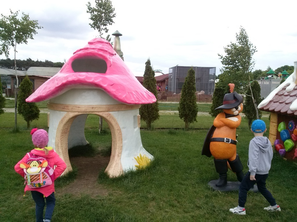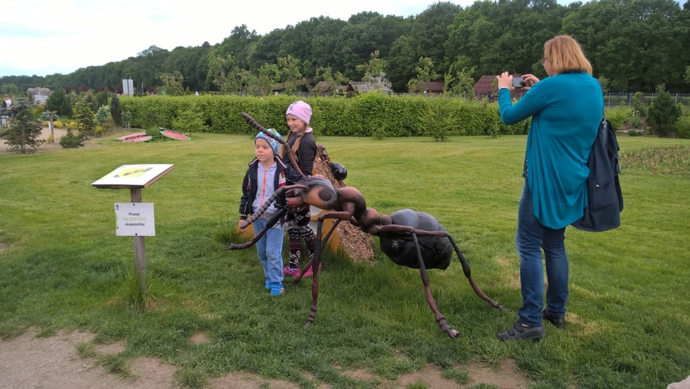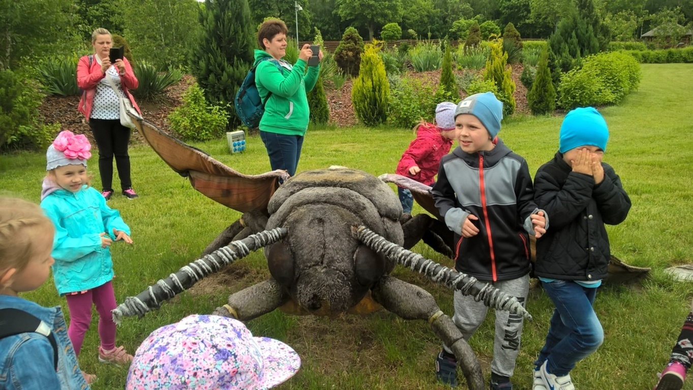 Zaraz po przyjeździe dzieci mogły skorzystać z sali zabaw, następnie uczestniczyły we warsztatach przyrodniczych dotyczących okresu prehistorycznego oraz zwierząt będących pod ochroną. Potem wyruszyliśmy razem z panią przewodnik zwiedzać teren parku. Tu czekało na nas wiele atrakcji – mini ZOO – mogliśmy przyjrzeć się z bliska zwierzętom domowym i egzotycznym. Dalej dzieci podziwiały wystawę gigantycznych owadów zamieszkujących teren Wielkopolski oraz prehistorycznych zwierząt np. mamuty. Najwspanialsze było to, że rozmiar XXL zwierząt pozwalał dostrzec najdrobniejsze szczegóły ich budowy. W parku znajdowały się również miniaturowe budowle z całego świata np. Wieża Eiffla, Tadż Mahal, Alcatraz.