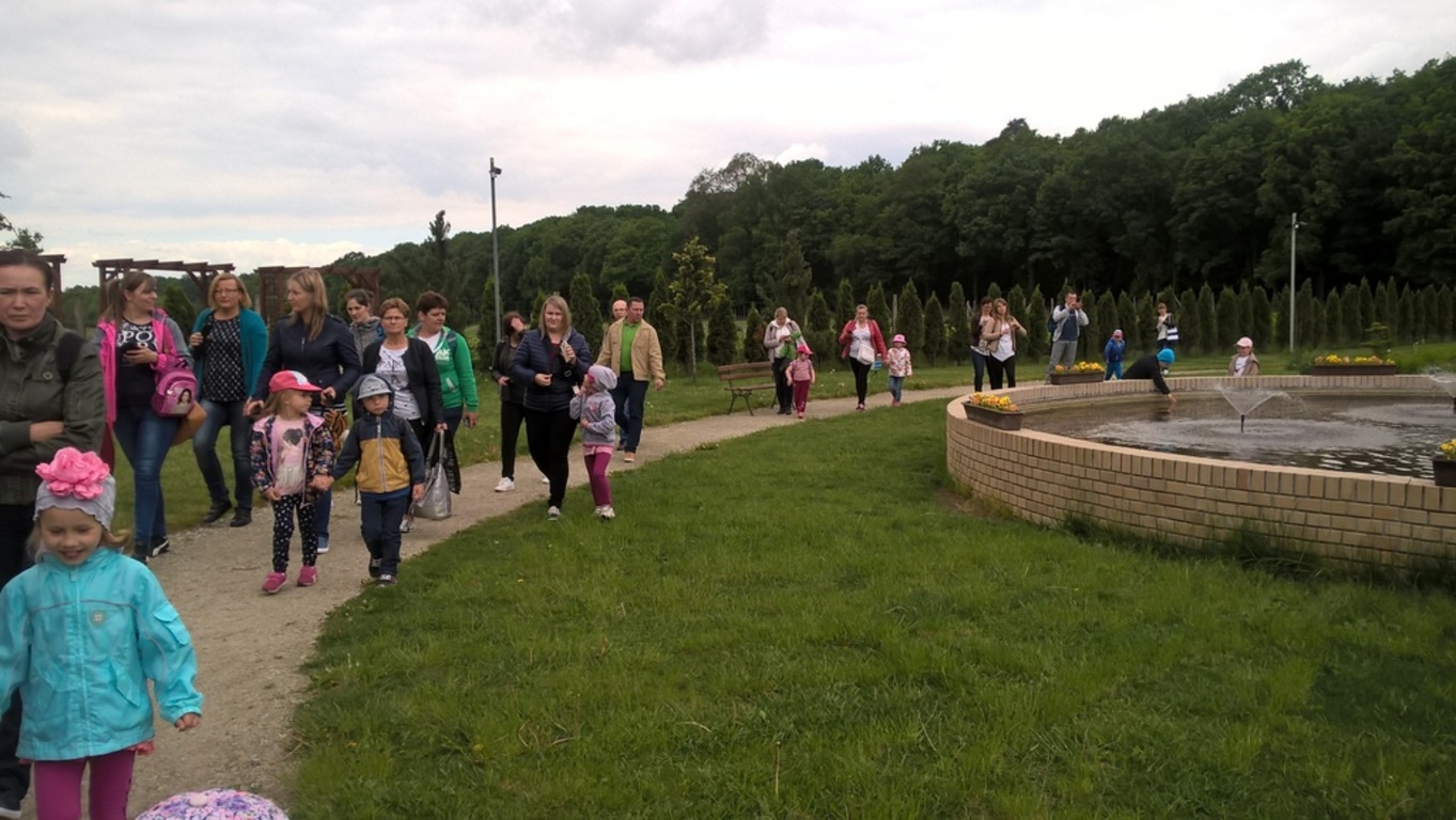 Najwięcej wrażeń,szczególnie wśród rodziców, wywołał spacer po PODNIEBNEJ EKO WIOSCE, składającej się z mostów linowych i domków zawieszonych ok. 50 m. nad ziemią. Trasa wioski przebiegała między drzewami, a przejście mostami dla niektórych wymagało sporej odwagi. Jednak przedszkolaki poradziły sobie z tym wyśmienicie. Kolejną atrakcją było ognisko, wspólnie piekliśmy i zajadaliśmy się kiełbaskami z ogniska. To nie był jeszcze koniec niespodzianek- do dyspozycji dzieci były duże i bardzo fajne place zabaw. Tu nasze przedszkolaki mogły szaleć do woli: zjeżdżać, wspinać się i skakać. Rodzice mogli wraz z dziećmi raz jeszcze pospacerować po parku, który zachwycał przepięknymi skwerami pełnymi kwiatów i krzewów oraz tajemniczymi zielonymi zaułkami z ławeczkami, gdzie można było wspaniale wypocząć i podziwiać uroki parku.