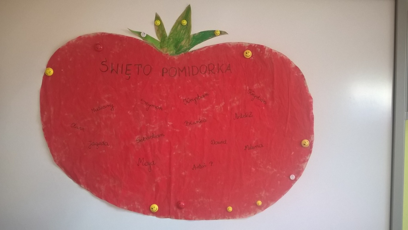 Z okazji święta pomidorka na sali maluszków zrobiło się czerwono, każdy przedszkolak ubrał przynajmniej 1 rzecz koloru czerwonego, skosztowaliśmy pomidora, bawiliśmy się przy pomidorowej piosence, słuchaliśmy wierszy o pomidorach oraz poznaliśmy potrawy, których głównym składnikiem jest to warzywo. Na koniec całą grupą wykonaliśmy pracę plastyczną w postaci ogromnego pomidora, którego pomalowaliśmy oczywiście na kolor czerwony:)