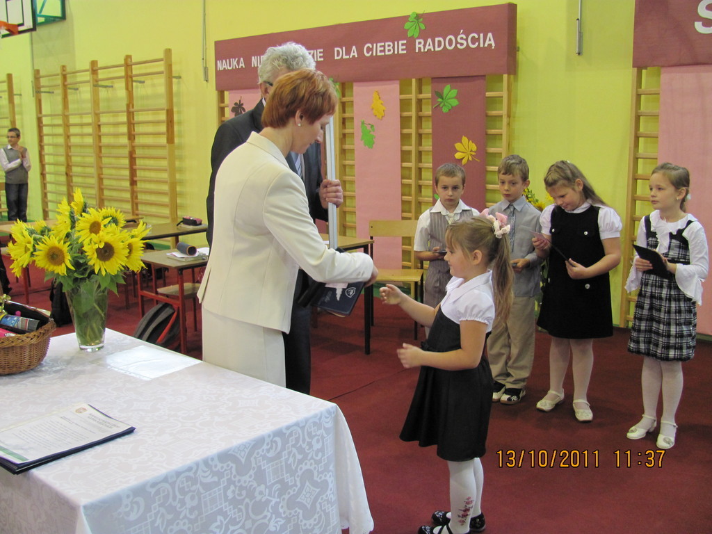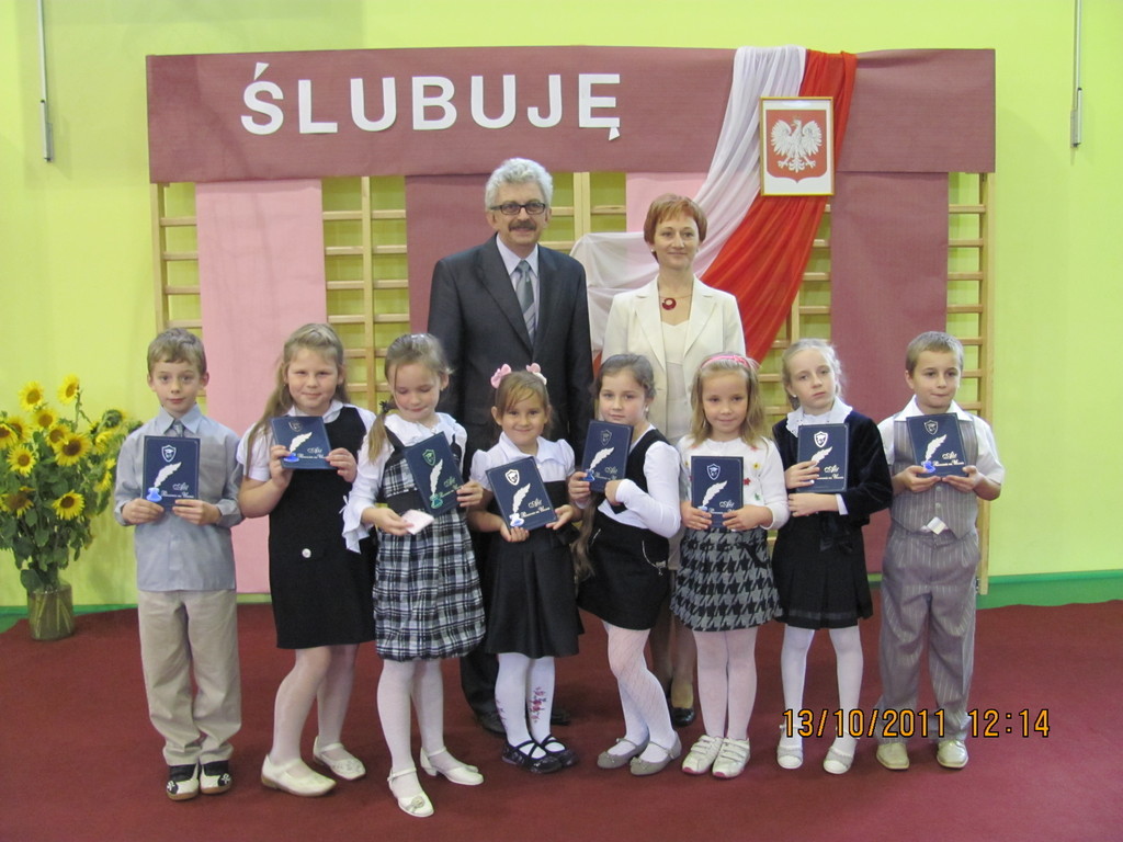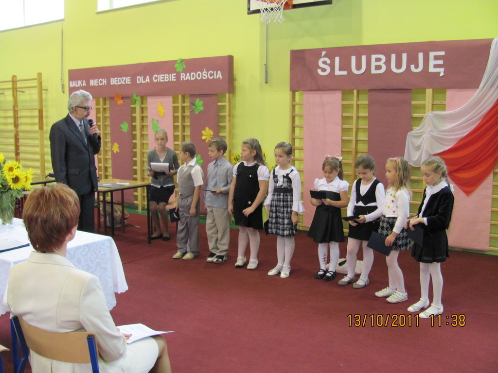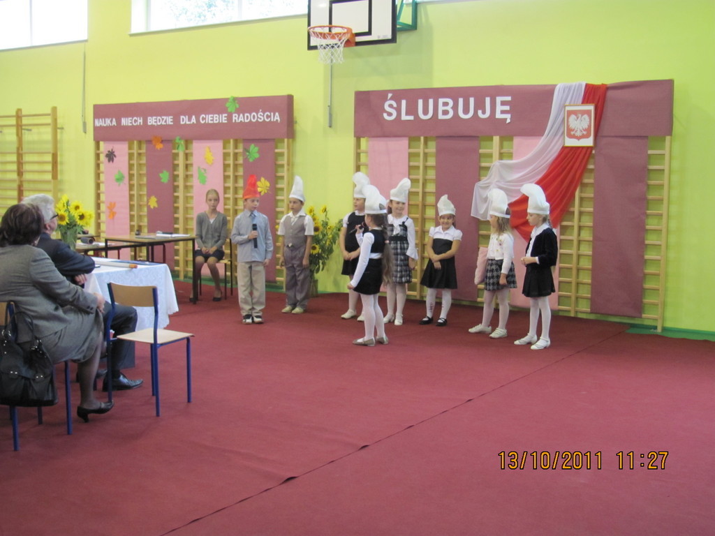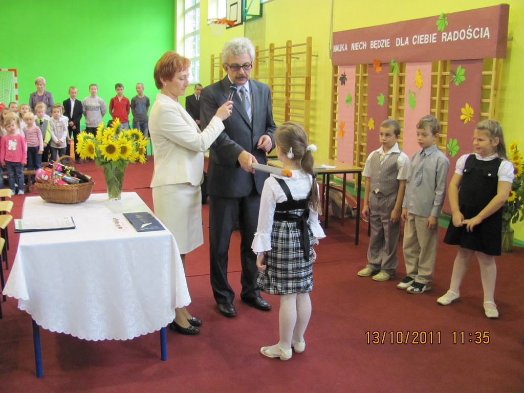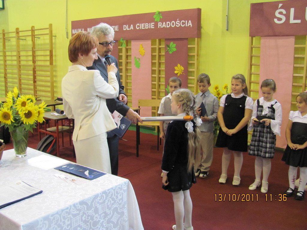 Tymi słowami przewodnicząca szkolnego samorządu uczniowskiego przywitała pierwszoklasistów, którzy 13 października 2011r. mieli stać się prawdziwymi uczniami naszej szkoły. Zanim dyrektor szkoły Bartłomiej Rogala dokonał uroczystego pasowania, pierwszoklasiści złożyli ślubowanie na sztandar szkoły oraz przedstawili program artystyczny wcielając się w bajkowe smerfy.