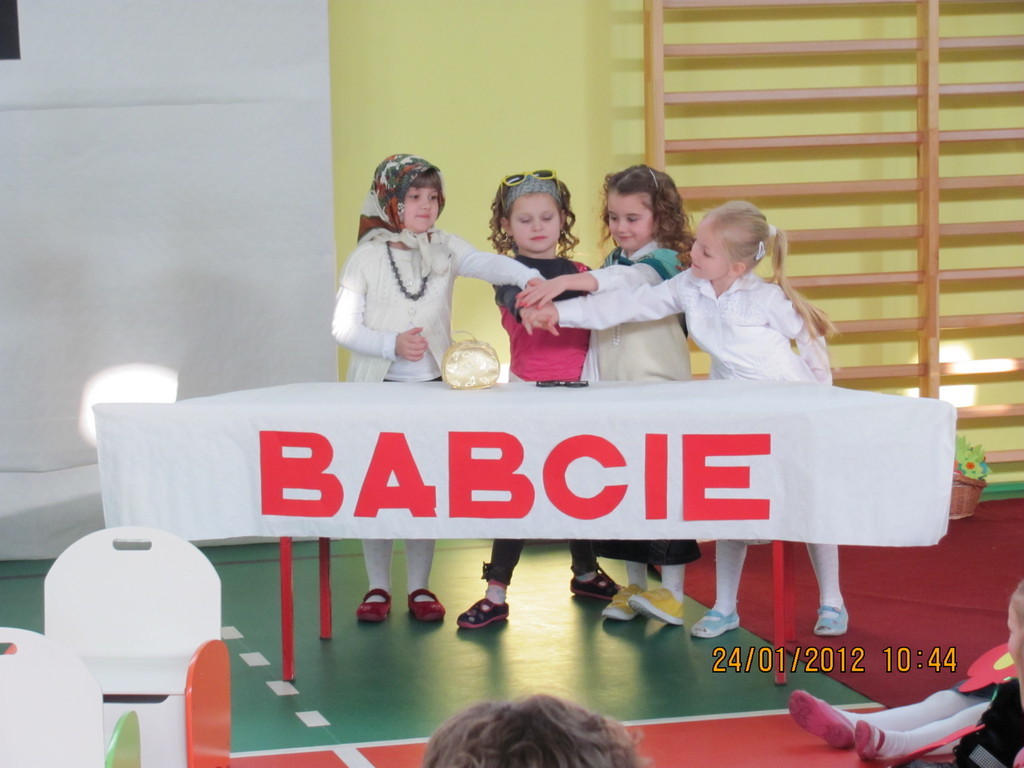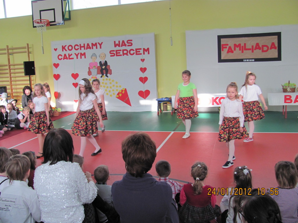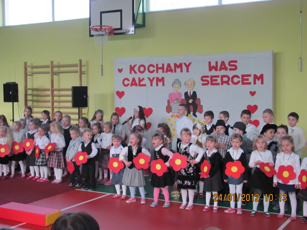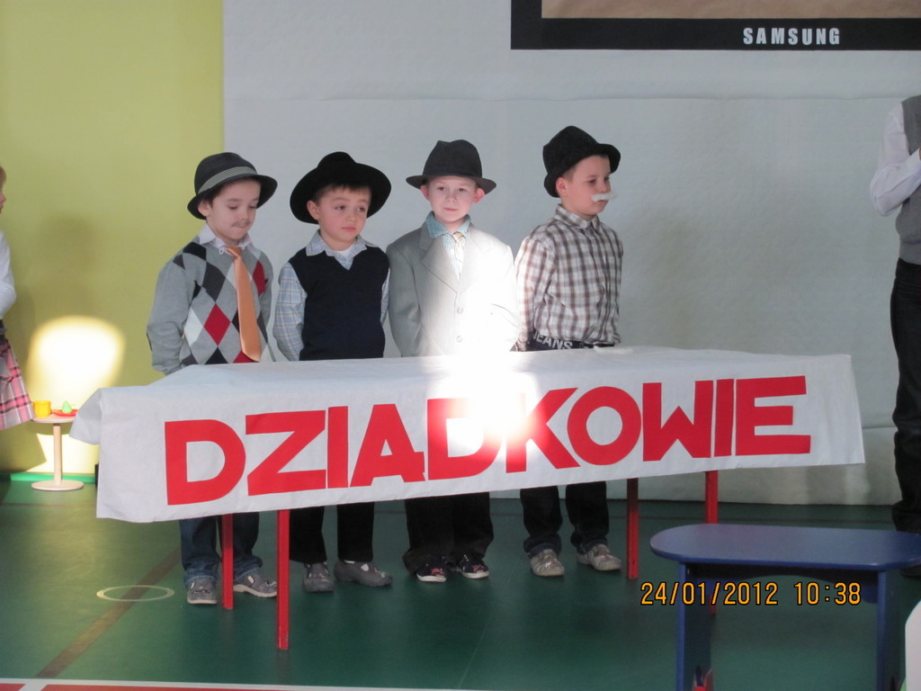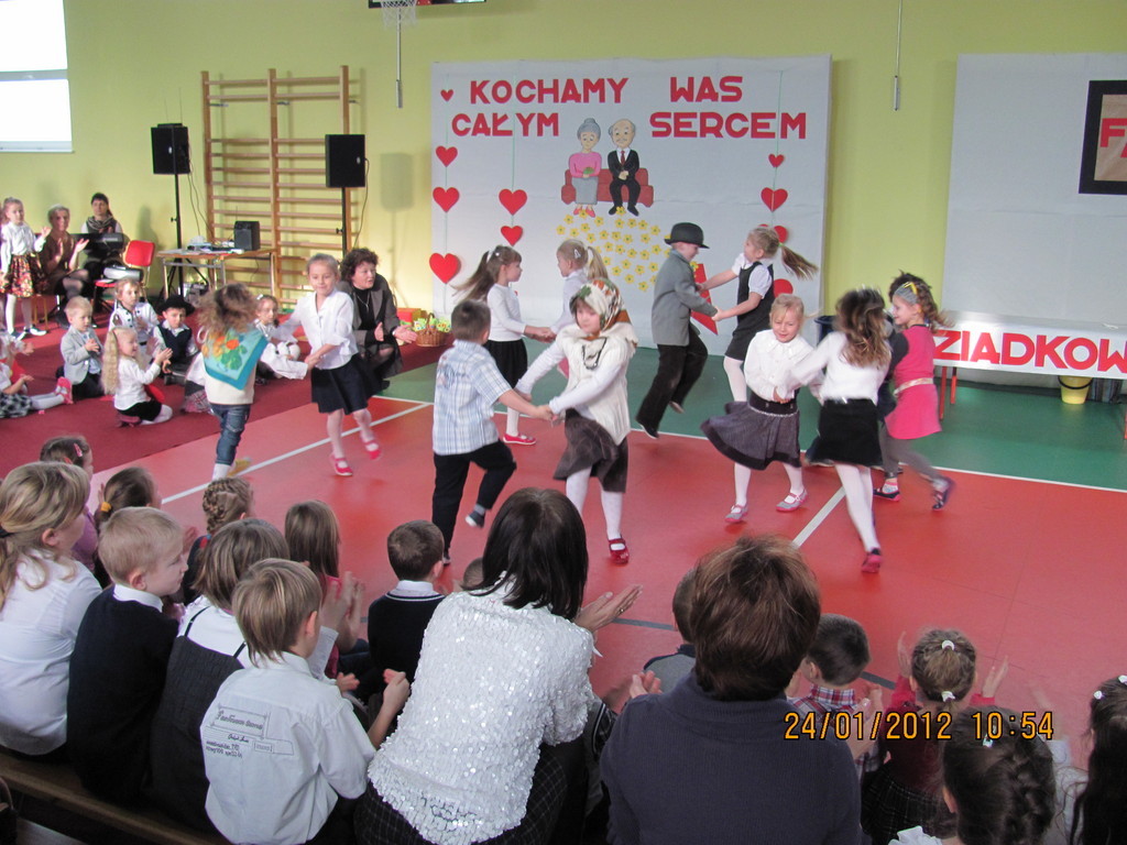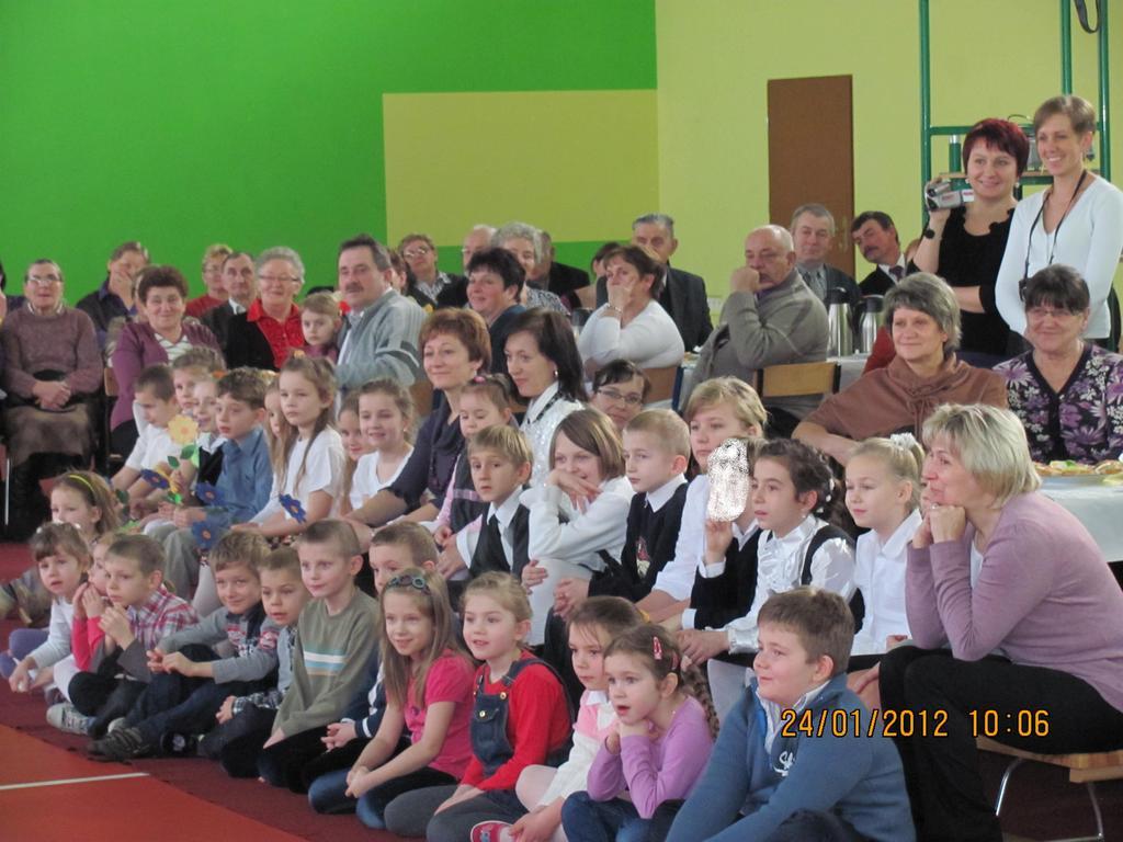 Dnia 24 stycznia 2012r. w naszej szkole odbyła się uroczystość z okazji Dnia Babci i Dziadka. Zaproszeni Dziadkowie licznie przybyli, by podziwiać występy swoich wnucząt. Przygotowane przez p. L. Staniek, p. K. Wierzowiecką, p. A. Trawińską i p. Z. Wojciechowską 3, 4 i 5-latki oraz drugoklasiści w wierszykach i piosenkach życzyli najbliższym zdrowia i wszelkiej pomyślności. 5-latki odegrały także scenkę wzorowaną na popularnym, telewizyjnym programie "Familiada", w której dzieci odtwarzające role Babć i Dziadków rywalizowały o punkty. Pojedynek zakończył się remisem, a nagrody- kosze pięknych laurek- dzieci zadedykowały swoim Babciom i Dziadkom.