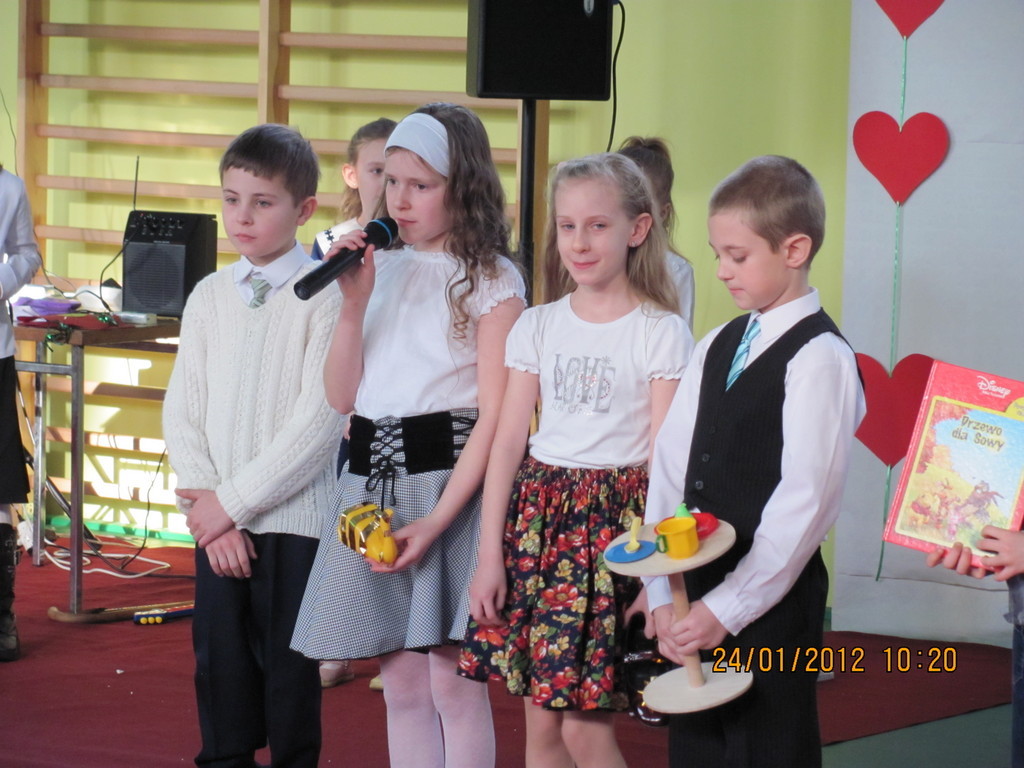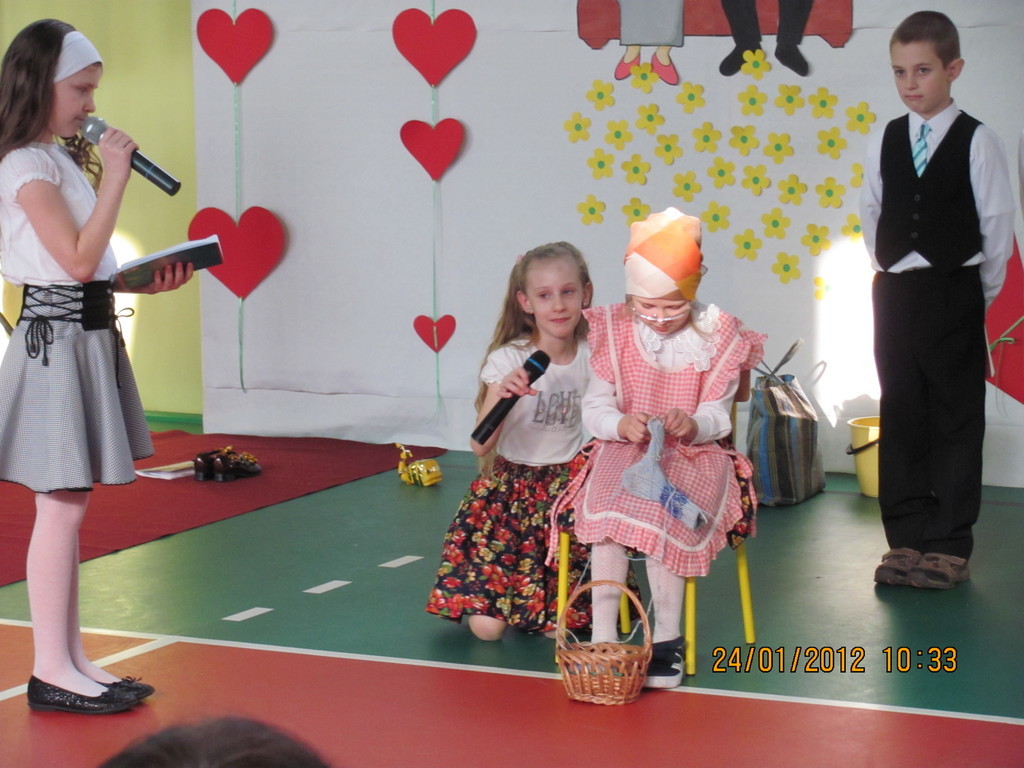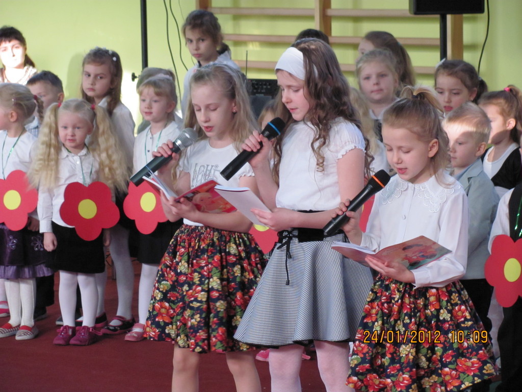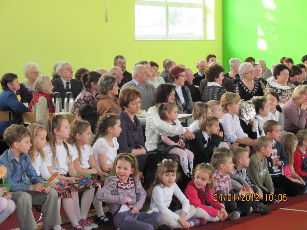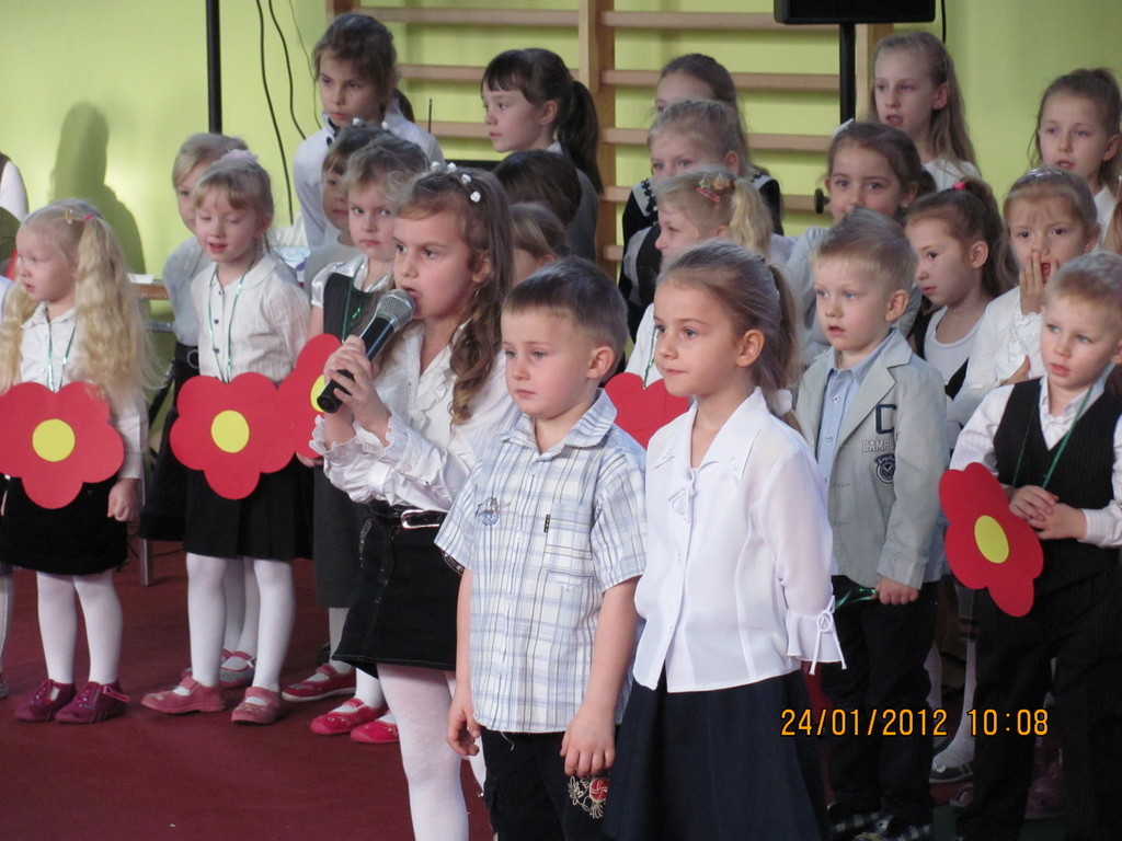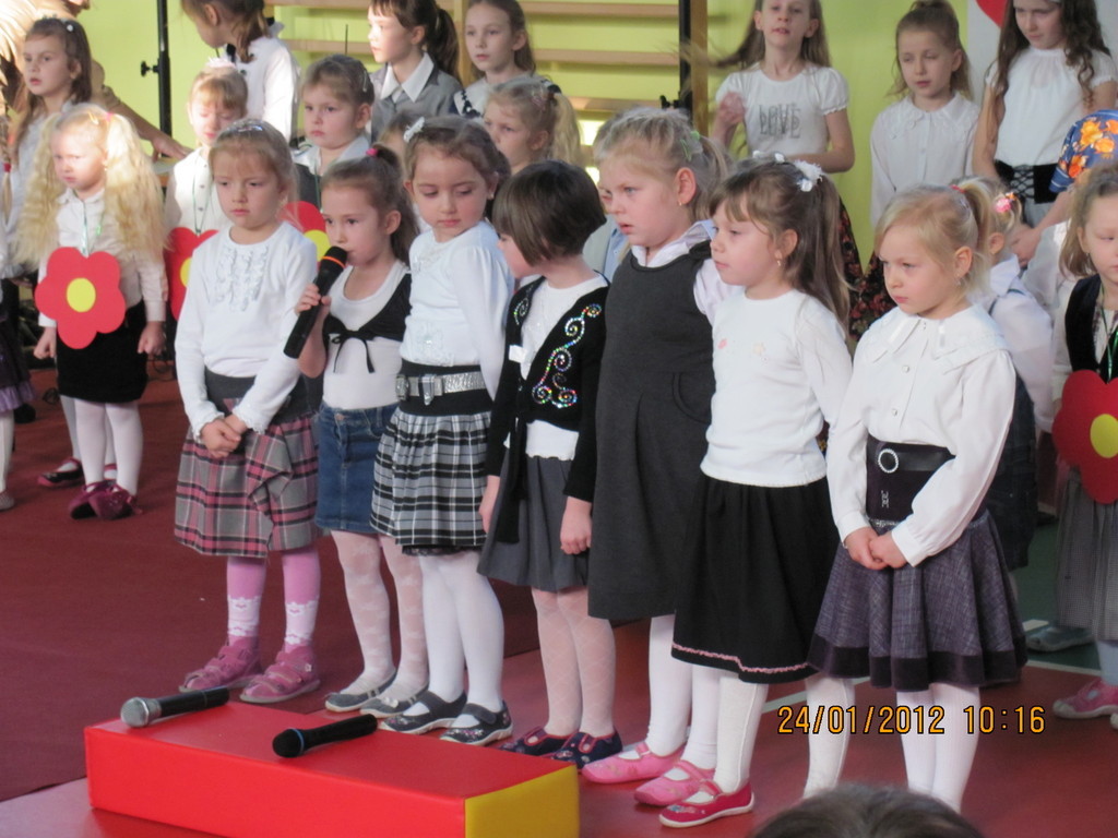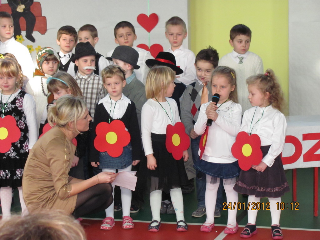 Dnia 24 stycznia 2012r. w naszej szkole odbyła się uroczystość z okazji Dnia Babci i Dziadka. Zaproszeni Dziadkowie licznie przybyli, by podziwiać występy swoich wnucząt. Przygotowane przez p. L. Staniek, p. K. Wierzowiecką, p. A. Trawińską i p. Z. Wojciechowską 3, 4 i 5-latki oraz drugoklasiści w wierszykach i piosenkach życzyli najbliższym zdrowia i wszelkiej pomyślności. 5-latki odegrały także scenkę wzorowaną na popularnym, telewizyjnym programie "Familiada", w której dzieci odtwarzające role Babć i Dziadków rywalizowały o punkty. Pojedynek zakończył się remisem, a nagrody- kosze pięknych laurek- dzieci zadedykowały swoim Babciom i Dziadkom.