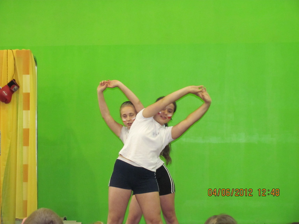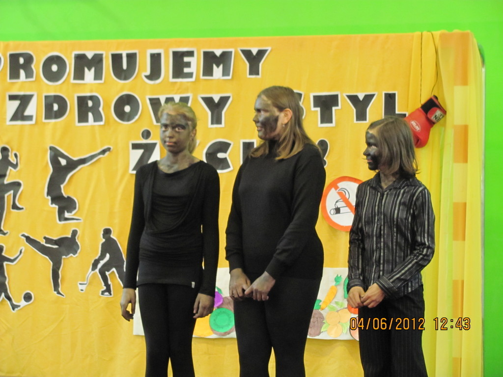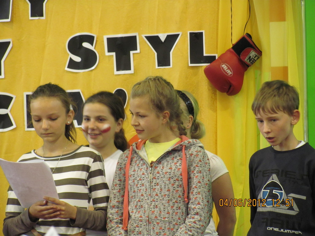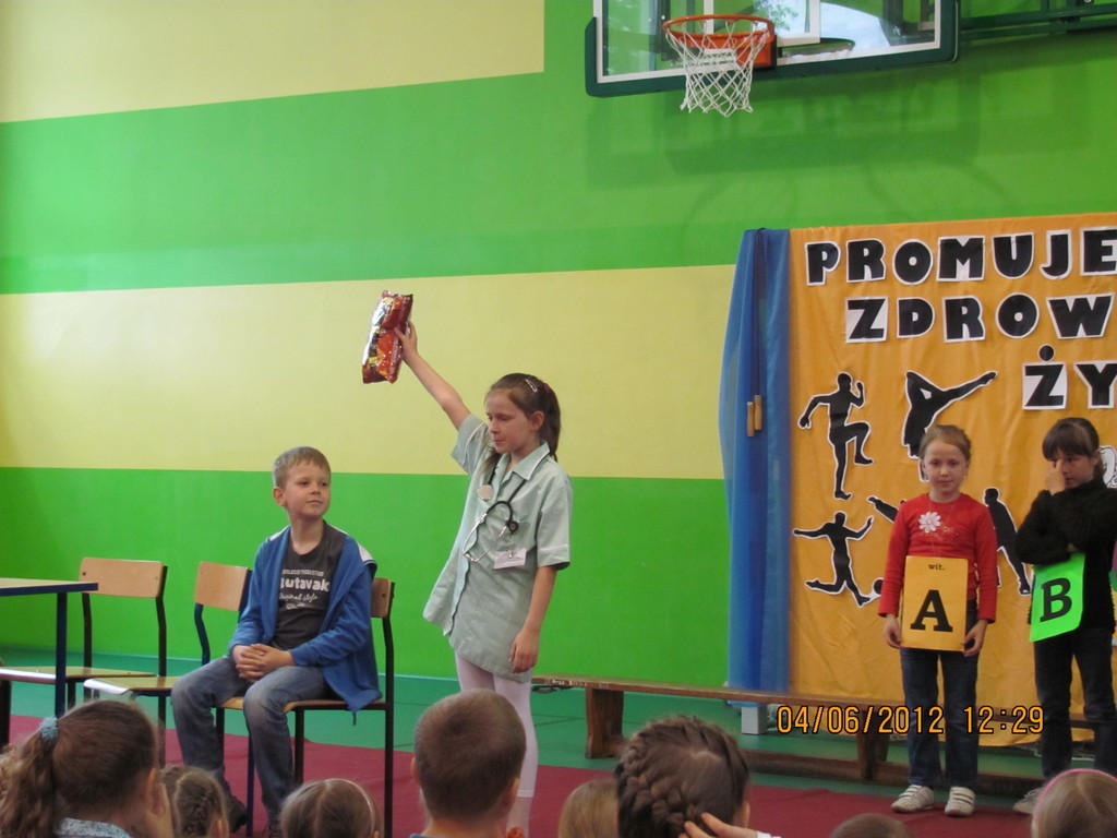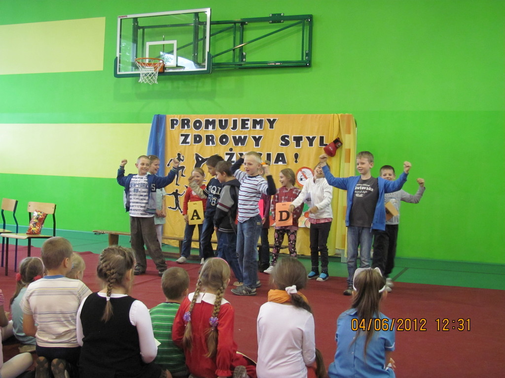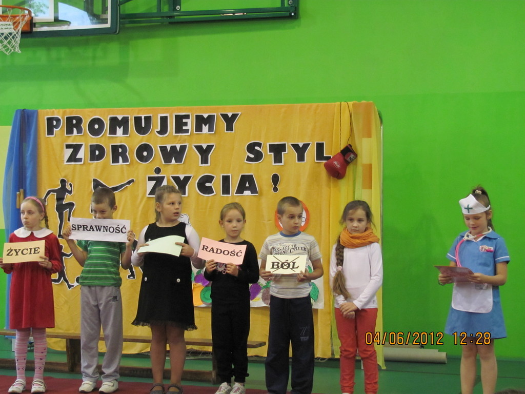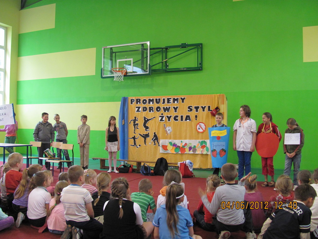 Dnia 4 czerwca w naszej szkole odbył się apel z częścią artystyczną pod hasłem „Promujemy Zdrowy Styl Życia”, w którym klasy 1-6 pod opieką p. Magdaleny Fabich-Bondzyło przedstawiły prezentacje zgodnie z przydzielonymi wcześniej kategoriami. Na początku kl. I wyjaśniła wszystkim swoją własną definicję zdrowia. Z kolei kl. II omówiła rolę witamin i składników odżywczych. Kl. III poruszyła problem higieny osobistej, imitując wersję znanego programu telewizyjnego „Pytanie na Śniadanie”. O zaletach warzyw i owoców a także o niezdrowym odżywianiu opowiedziała kl. IV, dzięki której mieliśmy okazję przenieść się w przyszłość i poznać losy bohaterów propagujących zdrowy oraz niezdrowy tryb życia. Zadaniem kl. V było wyjaśnienie wszystkim – dlaczego nie warto palić papierosów. Zaprezentowano m.in. badanie naukowe dotyczące przyczyn długowieczności. Kl. VI wyjaśniła wszystkim, jak ważny jest sport i ruch w naszym życiu. Z tej okazji, by zachęcić młodszych uczniów do „ruszania się na zdrowie”, w prezentacji wzięli udział sportowcy z tej klasy, mający na koncie takie zwycięstwa jak: zdobycie I a później II miejsca w Biegu Maćka, I miejsca w rzucie piłką lekarską, I miejsca w tenisie stołowym, III miejsca w rozgrywkach piłki ręcznej. Był też wywiad ze słynnym piłkarzem, Cristiano Ronaldo, w którego rolę wcielił się jeden z uczniów. Część pierwszą zakończył pokaz aerobiku.