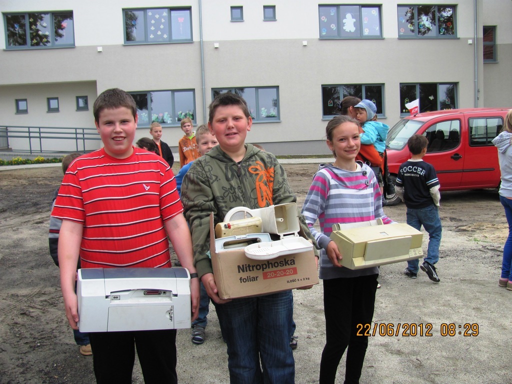 W drugim semestrze roku szkolnego 2011/2012 został ogłoszony konkurs dla szkół „Zadbaj o środowisko razem z nami”, zorganizowany przez firmę Karat Elektro Recykling w Toruniu. Akcja, którą nadzorował Samorząd Uczniowski, miała na celu zebranie zużytego sprzętu elektrycznego i elektronicznego. Odbiór sprzętu miał miejsce 22 czerwca od godz. 8.00. W konkursie wzięły udział 94 szkoły. Szkoła z najlepszym wynikiem zebrała 235,59 kg sprzętu w przeliczeniu na 1 ucznia natomiast najsłabszy wynik to 0,5 kg na 1 ucznia. W naszej szkole, dzięki zaangażowaniu uczniów i rodziców, udało się zebrać 20,5 kg w przeliczeniu na 1 ucznia (czyli razem: 2 tony 460 kg), i tym samym – zajęliśmy zupełnie „przyzwoite” 37 miejsce. Warto podkreślić, że braliśmy udział w tym konkursie, jako jedyna szkoła z gminy i powiatu!!! Dziękujemy wszystkim za zaangażowanie! Choć konkurs obudził w nas ducha rywalizacji, ważniejszy od wyniku jest dla nas fakt, że czujemy się odpowiedzialni za środowisko (co udowodniliśmy) i dbamy o nie cały czas! A kiedy ruszy kolejna akcja – nie pozostaniemy obojętni