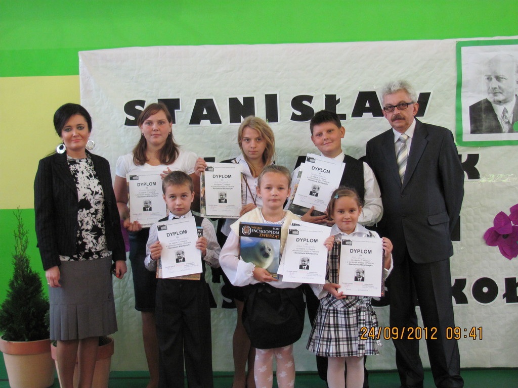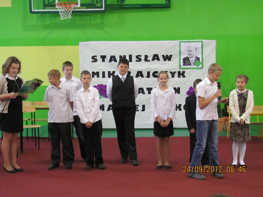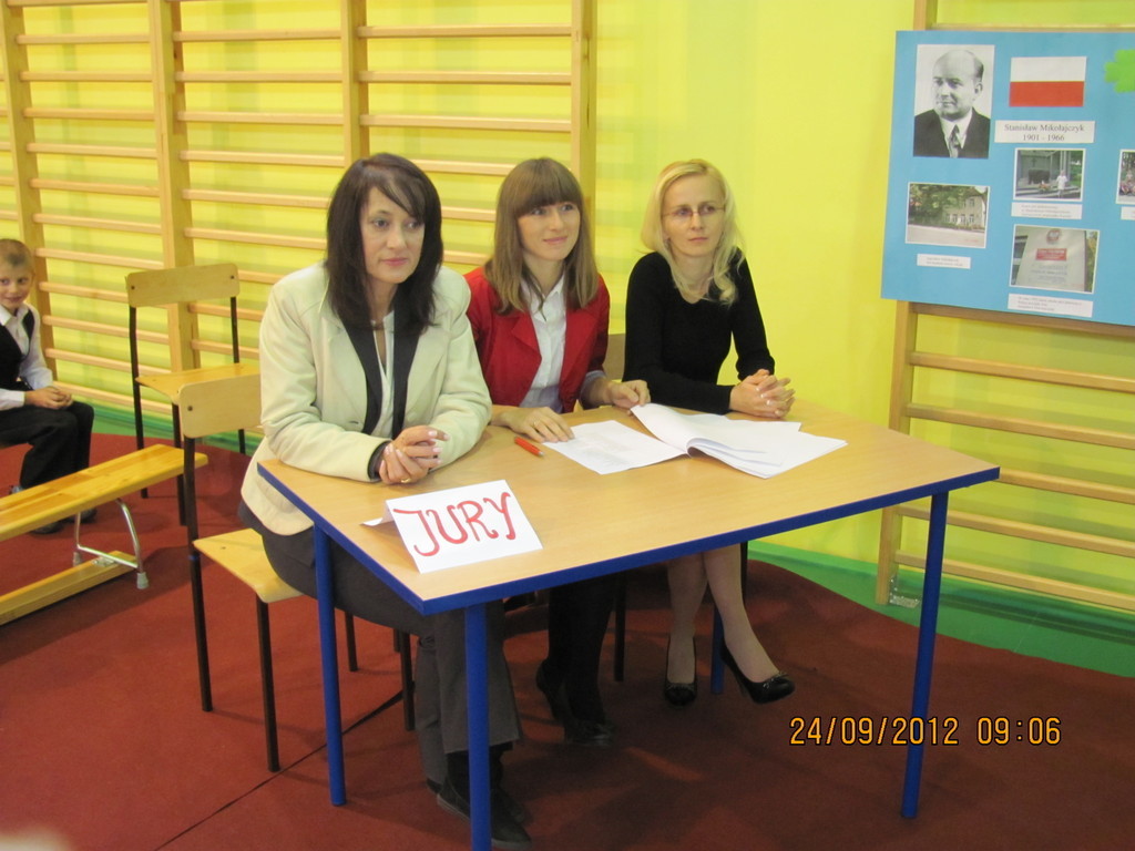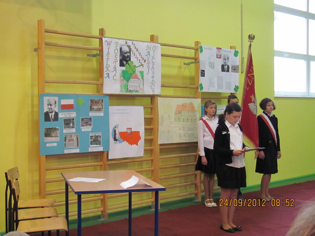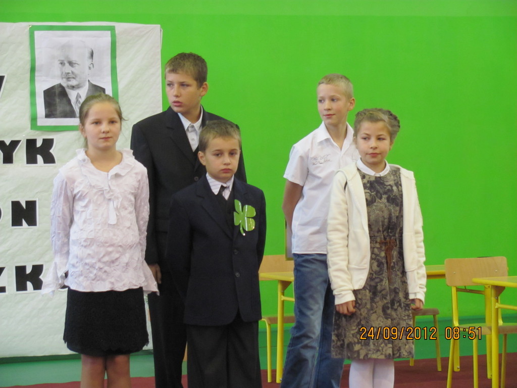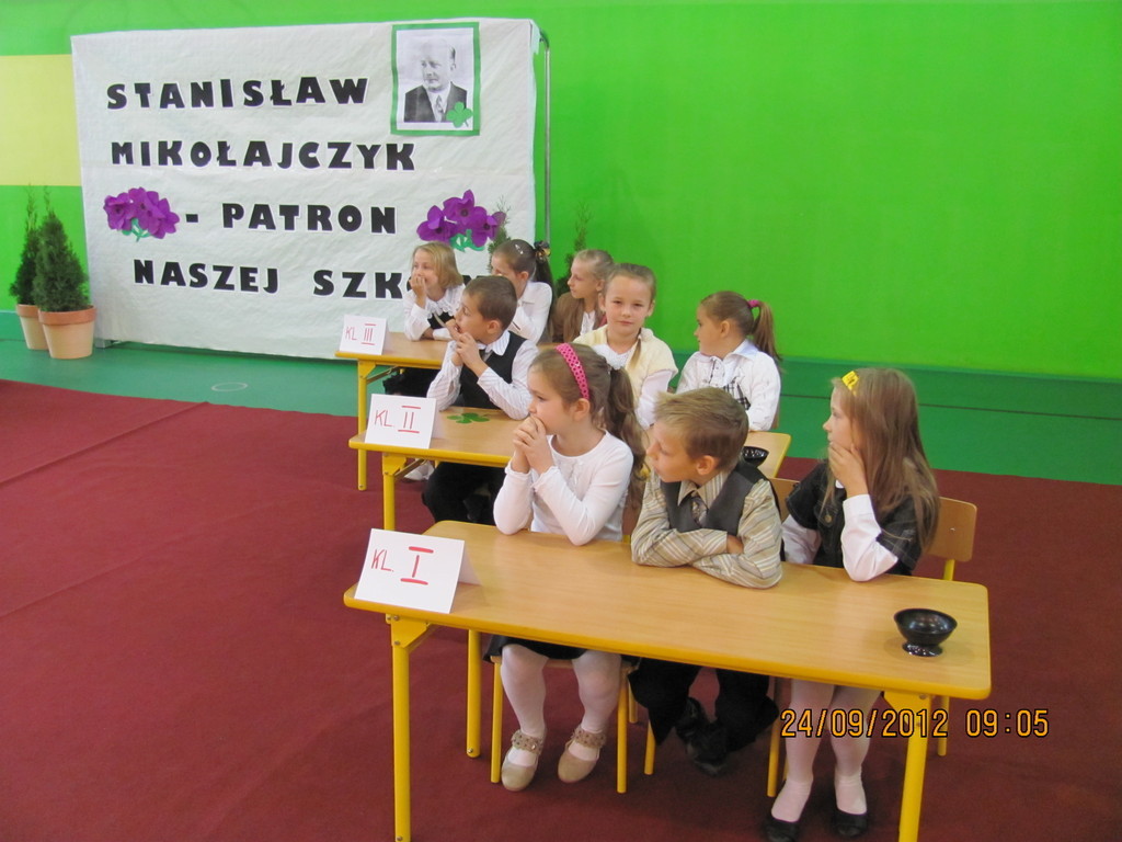 Dnia 24 września miały miejsce obchody Dnia Patrona. Z tej okazji Samorząd Uczniowski, pod opieką p. Magdaleny Fabich-Bondzyło, przygotował część artystyczną oraz konkurs wiedzowy – poświęcone Stanisławowi Mikołajczykowi. Na uroczystość zaproszono p. burmistrza Macieja Bratborskiego, byłego burmistrza p. Bolesława Kasprzaka oraz radnego p. Andrzeja Hencla, którzy jednak, w wyniku obowiązków służbowych, nie mogli przybyć do szkoły. W trakcie części artystycznej, wzorowanej na popularnym programie „Uwaga – kulisy sławy”, przedstawiono postać Stanisława Mikołajczyka; przypominając najważniejsze fakty z życia patrona. Po części oficjalnej delegacja samorządu złożyła kwiaty pod tablicą szkoły. Następnie przyszedł czas na konkurs – w którym wzięli udział przedstawiciele każdej z klas. Oprócz pytań konkursowych, ocenie podlegały również plakaty wykonane przez poszczególne klasy. Treść plakatu miała nawiązywać do hasła: „Stanisław Mikołajczyk – uczeń naszej szkoły”. W kategorii klas I-III zwyciężyła kl. II, którą reprezentowali: Oliwia Andrzejczak, Zofia Zimna, Karol Rynowiecki. Natomiast, spośród klas IV-VI zwycięstwo przypadło kl. VI, w składzie: Kinga Banaszak, Weronika Warkocka, Przemysław Maleszka. Zwycięzcy otrzymali dyplomy oraz nagrody książkowe, ufundowane przez Samorząd Uczniowski. Pozostali uczestnicy otrzymali dyplomy za aktywny udział w konkursie oraz zaangażowanie. Na zakończenie; na wszystkich uczestników uroczystości czekał pyszny (!) poczęstunek, przygotowany przez Radę Rodziców. Dziękujemy!