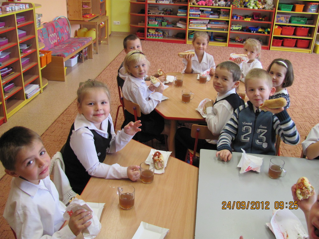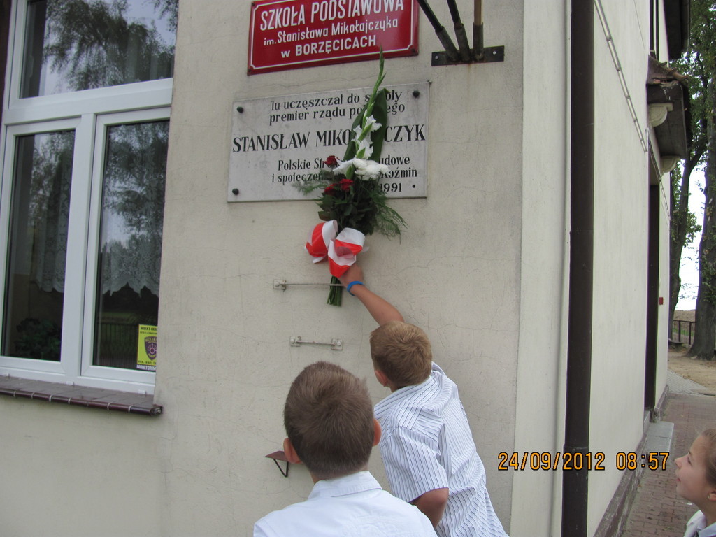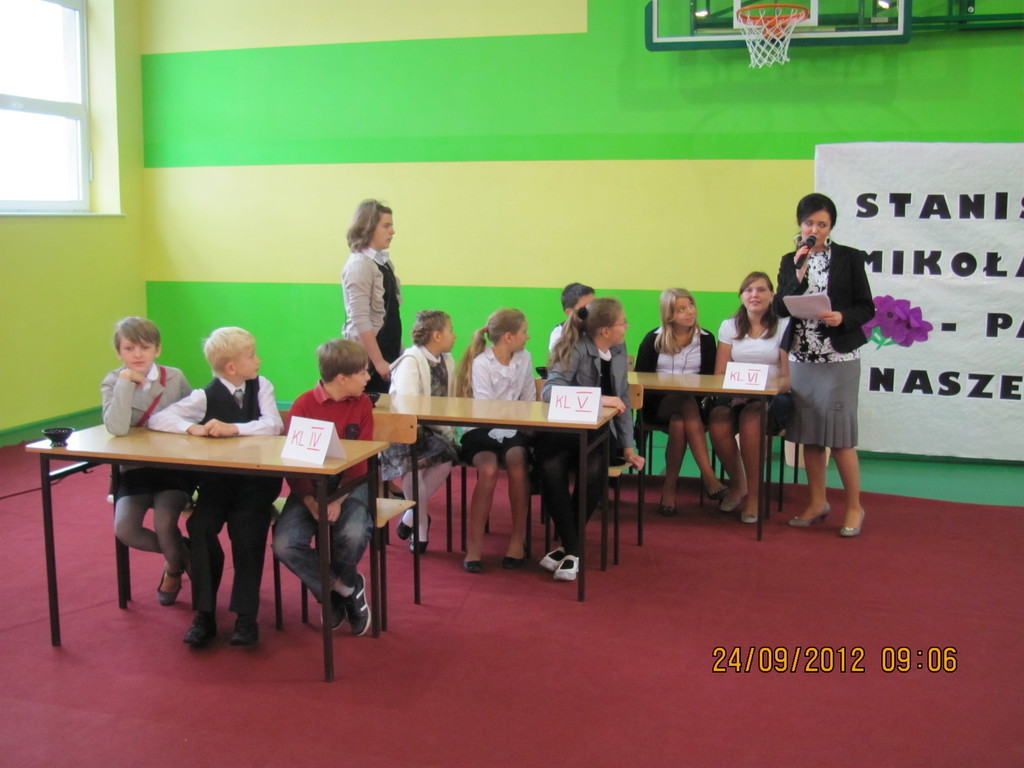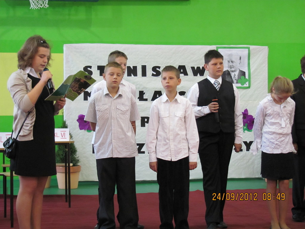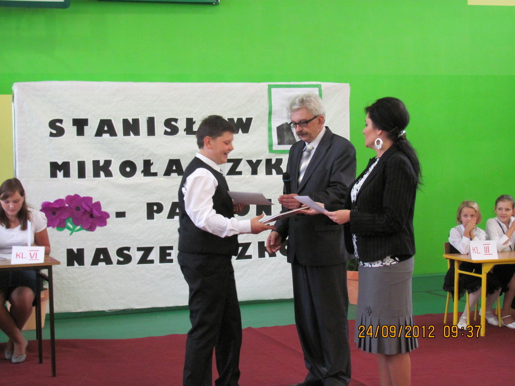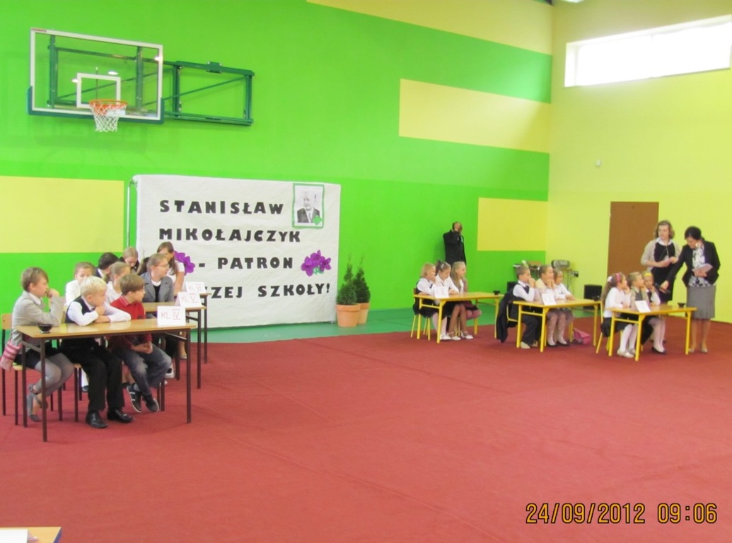 Dnia 24 września miały miejsce obchody Dnia Patrona. Z tej okazji Samorząd Uczniowski, pod opieką p. Magdaleny Fabich-Bondzyło, przygotował część artystyczną oraz konkurs wiedzowy – poświęcone Stanisławowi Mikołajczykowi. Na uroczystość zaproszono p. burmistrza Macieja Bratborskiego, byłego burmistrza p. Bolesława Kasprzaka oraz radnego p. Andrzeja Hencla, którzy jednak, w wyniku obowiązków służbowych, nie mogli przybyć do szkoły. W trakcie części artystycznej, wzorowanej na popularnym programie „Uwaga – kulisy sławy”, przedstawiono postać Stanisława Mikołajczyka; przypominając najważniejsze fakty z życia patrona. Po części oficjalnej delegacja samorządu złożyła kwiaty pod tablicą szkoły. Następnie przyszedł czas na konkurs – w którym wzięli udział przedstawiciele każdej z klas. Oprócz pytań konkursowych, ocenie podlegały również plakaty wykonane przez poszczególne klasy. Treść plakatu miała nawiązywać do hasła: „Stanisław Mikołajczyk – uczeń naszej szkoły”. W kategorii klas I-III zwyciężyła kl. II, którą reprezentowali: Oliwia Andrzejczak, Zofia Zimna, Karol Rynowiecki. Natomiast, spośród klas IV-VI zwycięstwo przypadło kl. VI, w składzie: Kinga Banaszak, Weronika Warkocka, Przemysław Maleszka. Zwycięzcy otrzymali dyplomy oraz nagrody książkowe, ufundowane przez Samorząd Uczniowski. Pozostali uczestnicy otrzymali dyplomy za aktywny udział w konkursie oraz zaangażowanie. Na zakończenie; na wszystkich uczestników uroczystości czekał pyszny (!) poczęstunek, przygotowany przez Radę Rodziców. Dziękujemy!