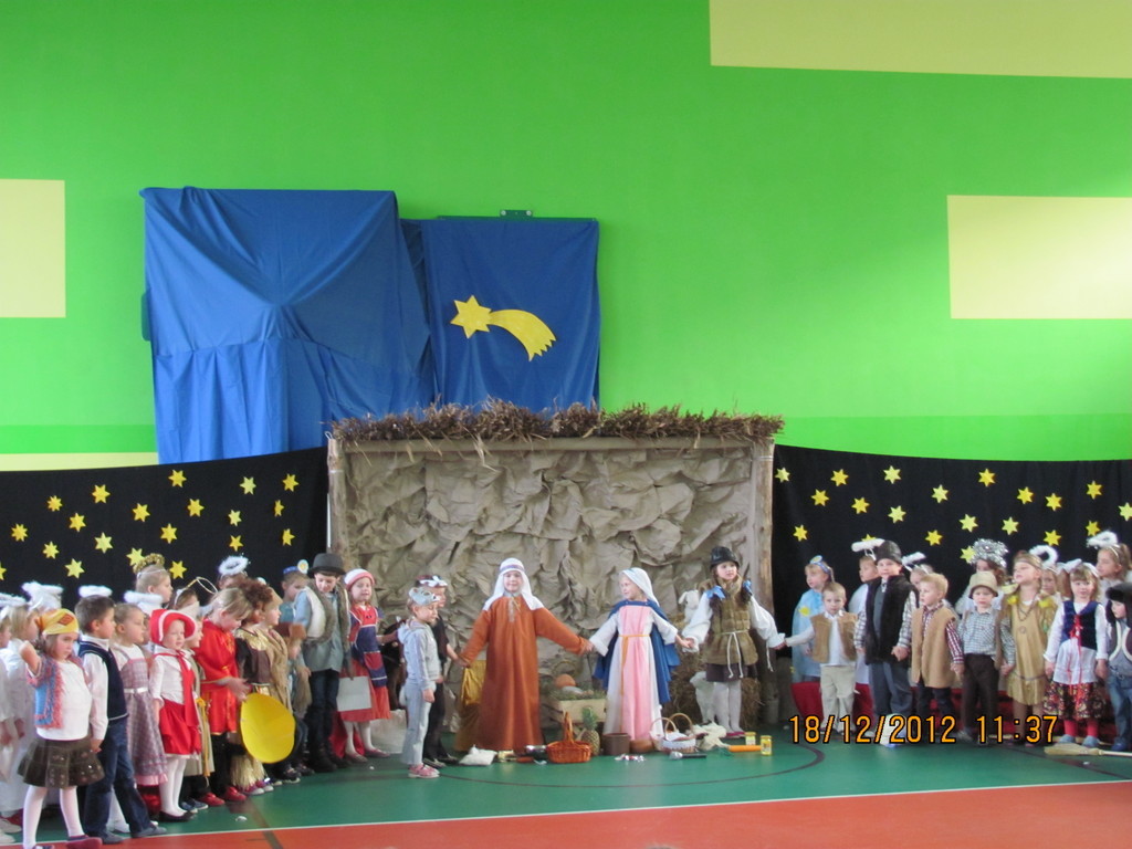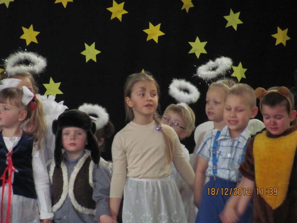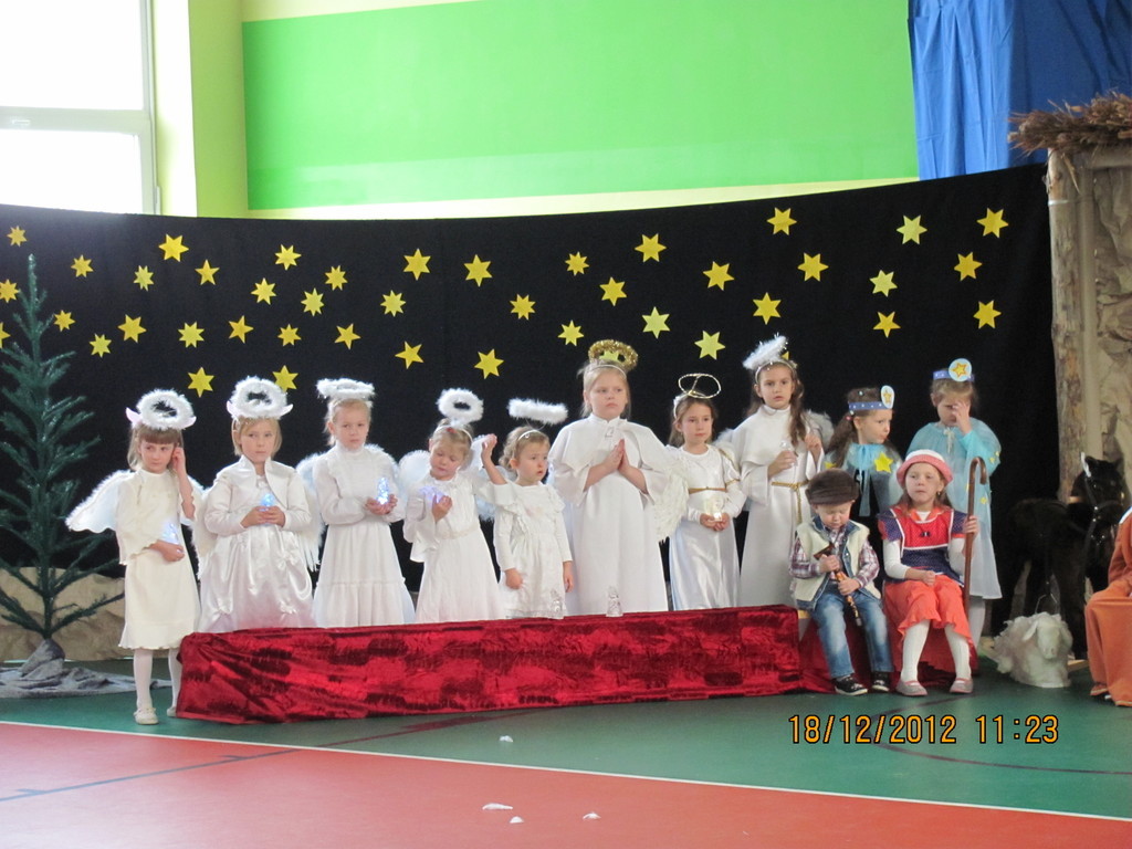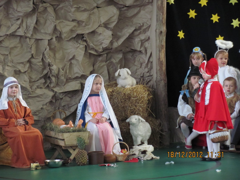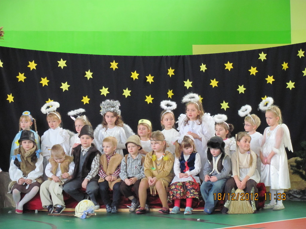 Święta Bożego Narodzenia to dla wszystkich, zarówno dorosłych jak i dzieci, najbardziej magiczny i rodzinny czas. Dlatego i my w naszym przedszkolu postanowiliśmy uczcić te święta przygotowując przedstawienie jasełkowe dla naszych najbliższych czyli rodziców oraz uczniów szkoły. W jasełkach wzięło udział 51 przedszkolaków z dwóch oddziałów przedszkolnych, które wcieliły się w różne role: aniołków, pasterzy, gwiazdek, dzieci z dalekich krajów oraz postaci bajkowych, były tam również leśne zwierzątka i oczywiście Święta Rodzina. W przepięknej scenografii, przy blasku migoczących lampionów, w miłej, świątecznej atmosferze dzieci wspaniale odegrały swoje role. Starsi uczniowie głośno bili brawo, a rodzice byli bardzo dumni ze swoich pociech. Zadowolone z występu przedszkolaki zebrały mnóstwo zasłużonych pochwał.