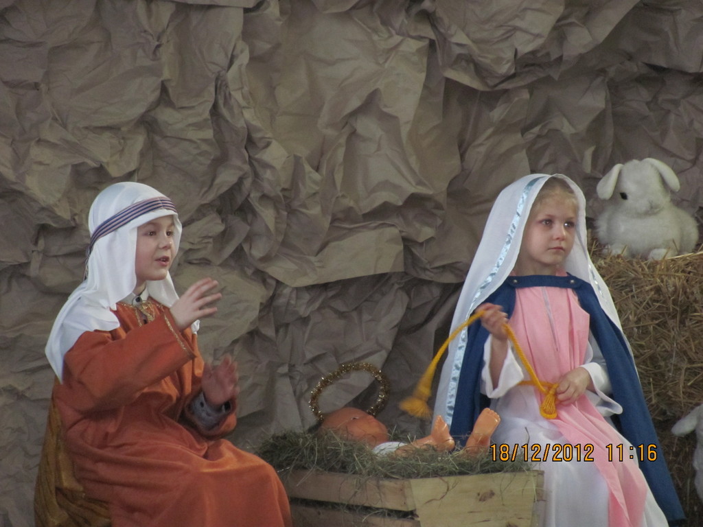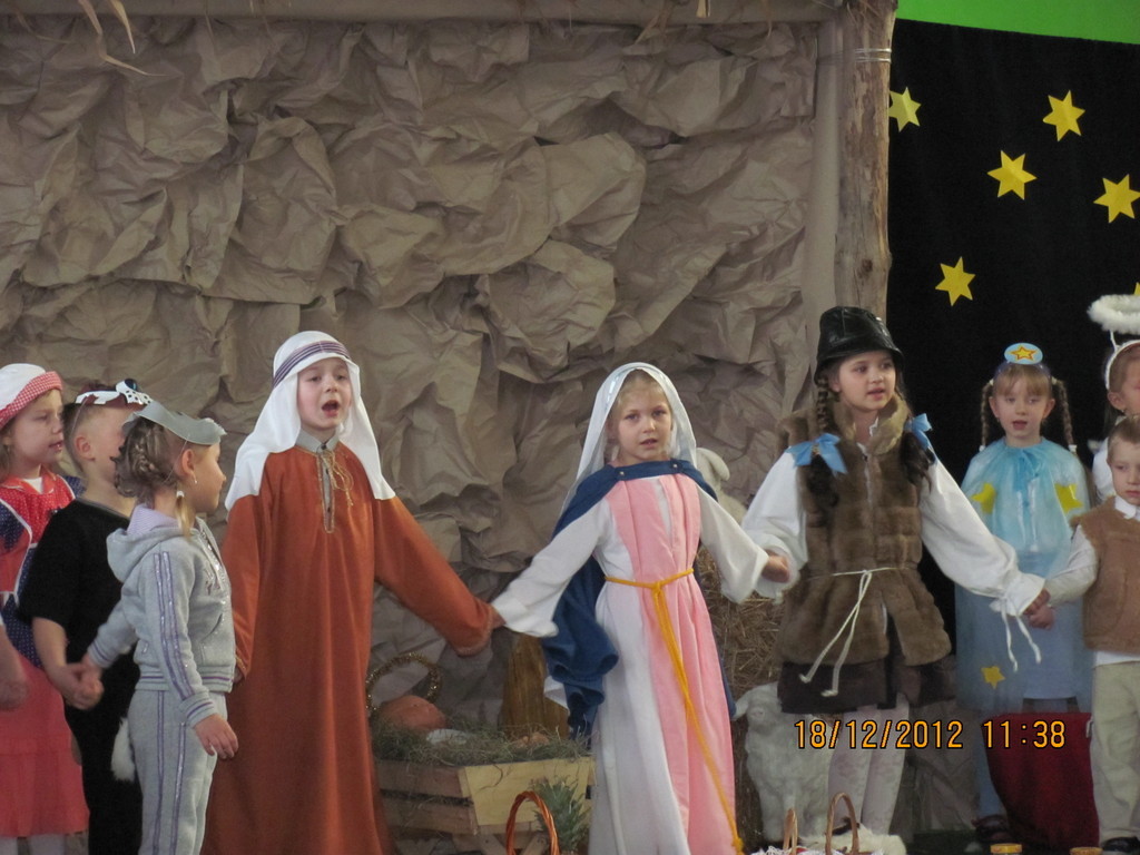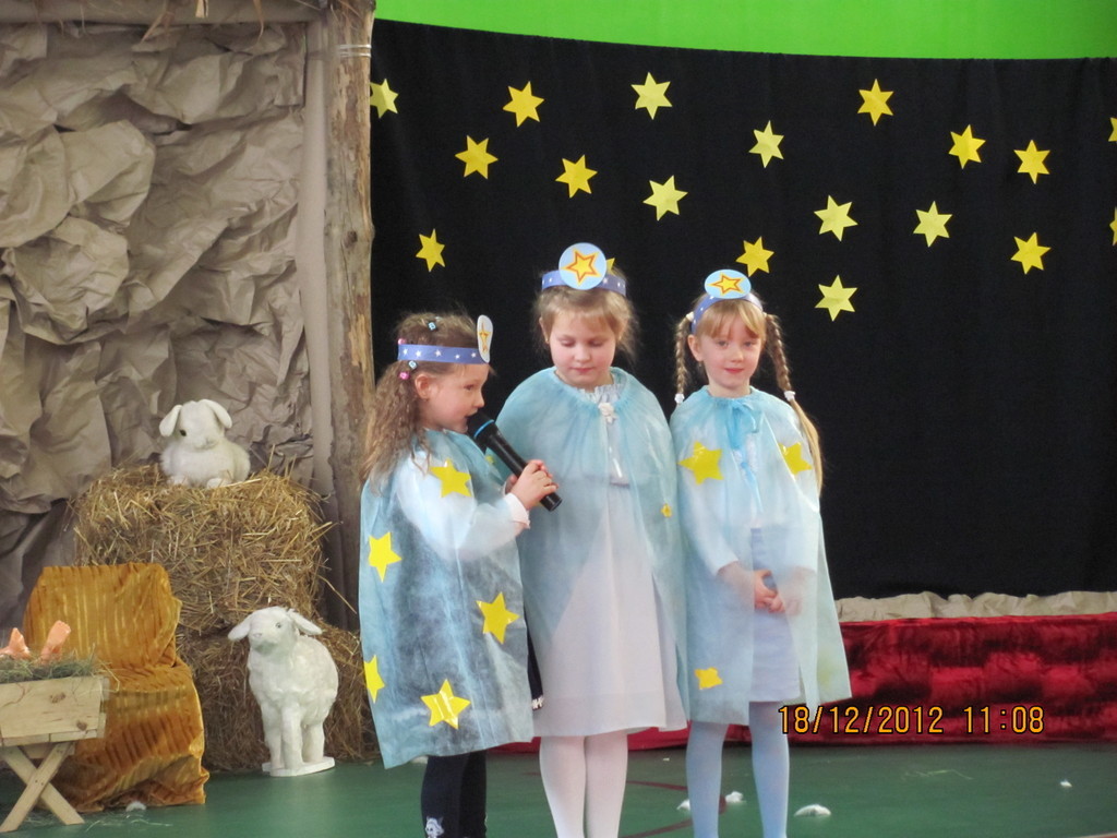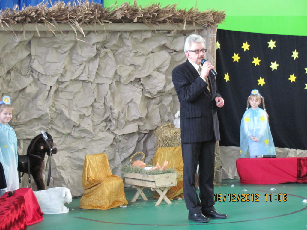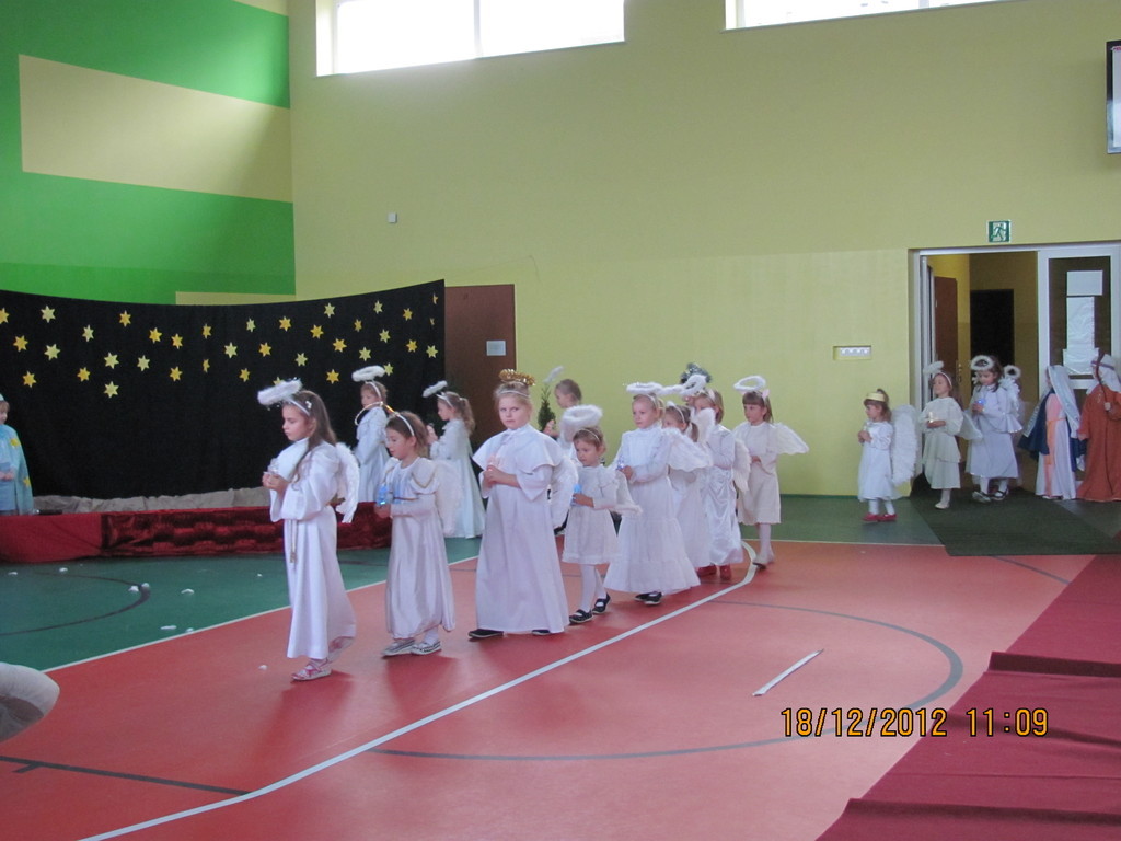 Święta Bożego Narodzenia to dla wszystkich, zarówno dorosłych jak i dzieci, najbardziej magiczny i rodzinny czas. Dlatego i my w naszym przedszkolu postanowiliśmy uczcić te święta przygotowując przedstawienie jasełkowe dla naszych najbliższych czyli rodziców oraz uczniów szkoły. W jasełkach wzięło udział 51 przedszkolaków z dwóch oddziałów przedszkolnych, które wcieliły się w różne role: aniołków, pasterzy, gwiazdek, dzieci z dalekich krajów oraz postaci bajkowych, były tam również leśne zwierzątka i oczywiście Święta Rodzina. W przepięknej scenografii, przy blasku migoczących lampionów, w miłej, świątecznej atmosferze dzieci wspaniale odegrały swoje role. Starsi uczniowie głośno bili brawo, a rodzice byli bardzo dumni ze swoich pociech. Zadowolone z występu przedszkolaki zebrały mnóstwo zasłużonych pochwał.