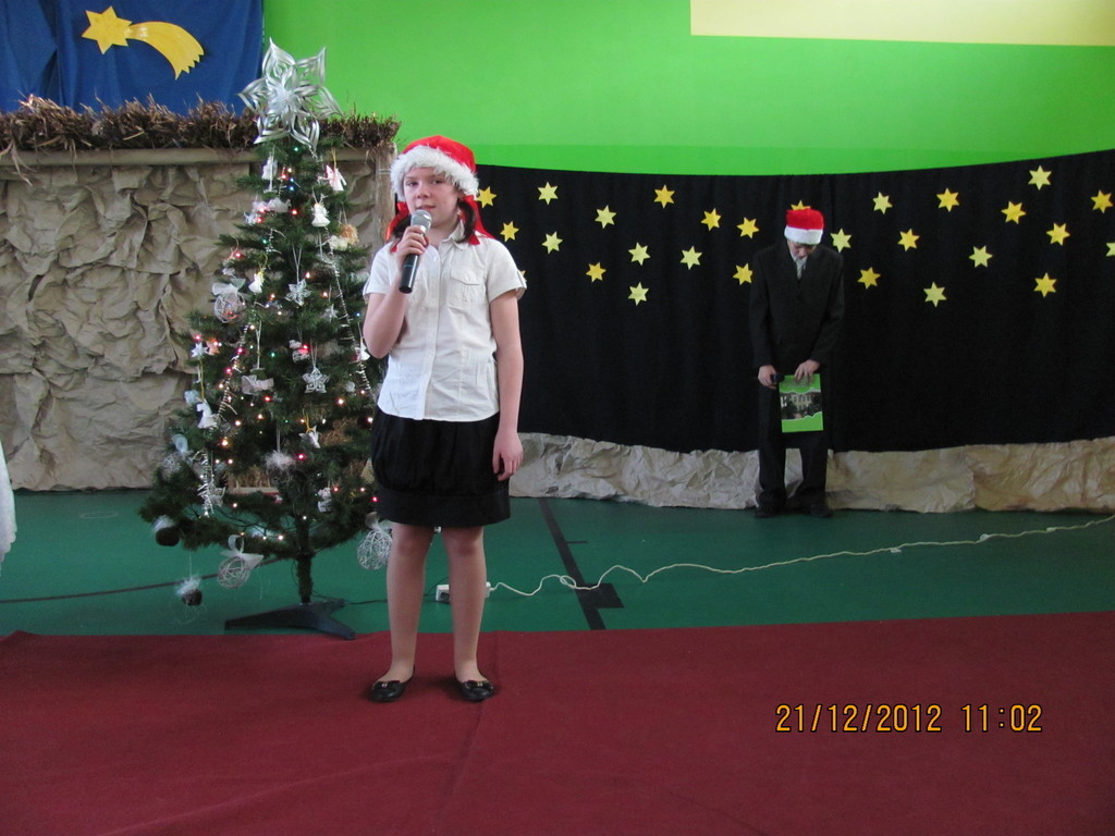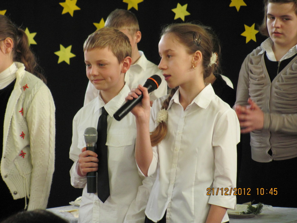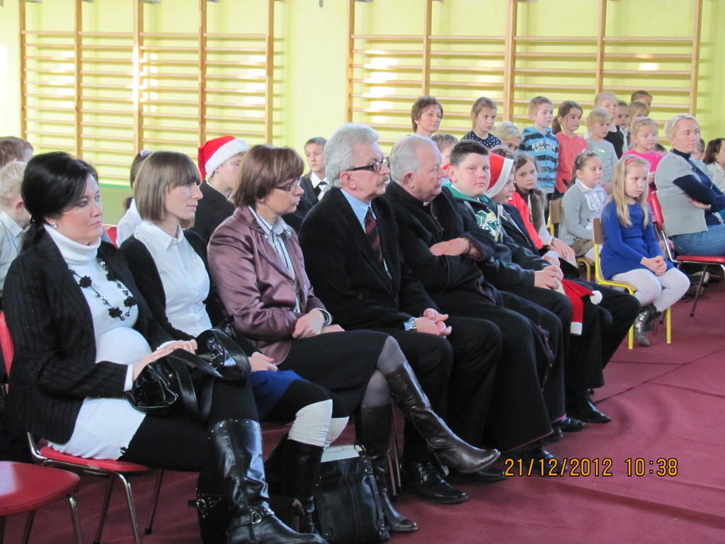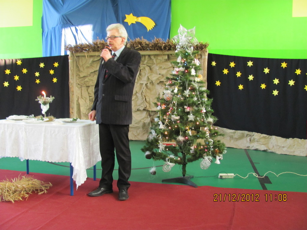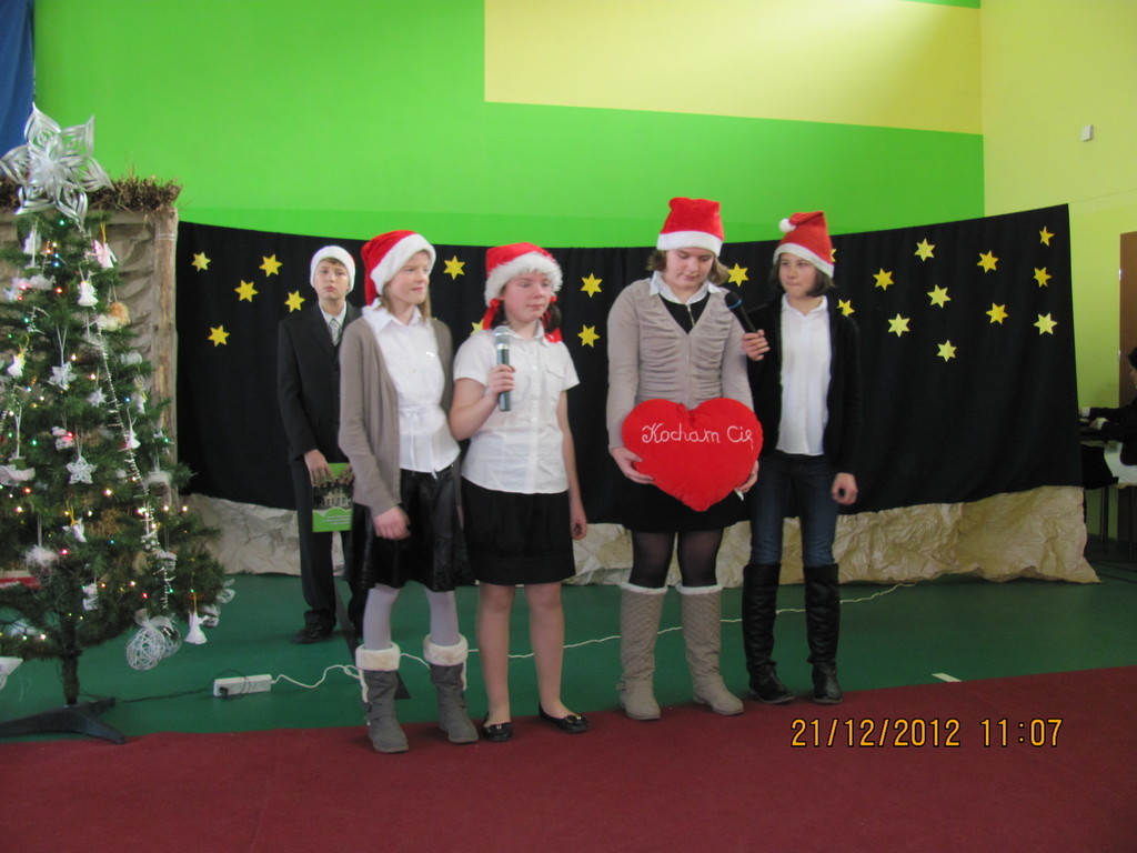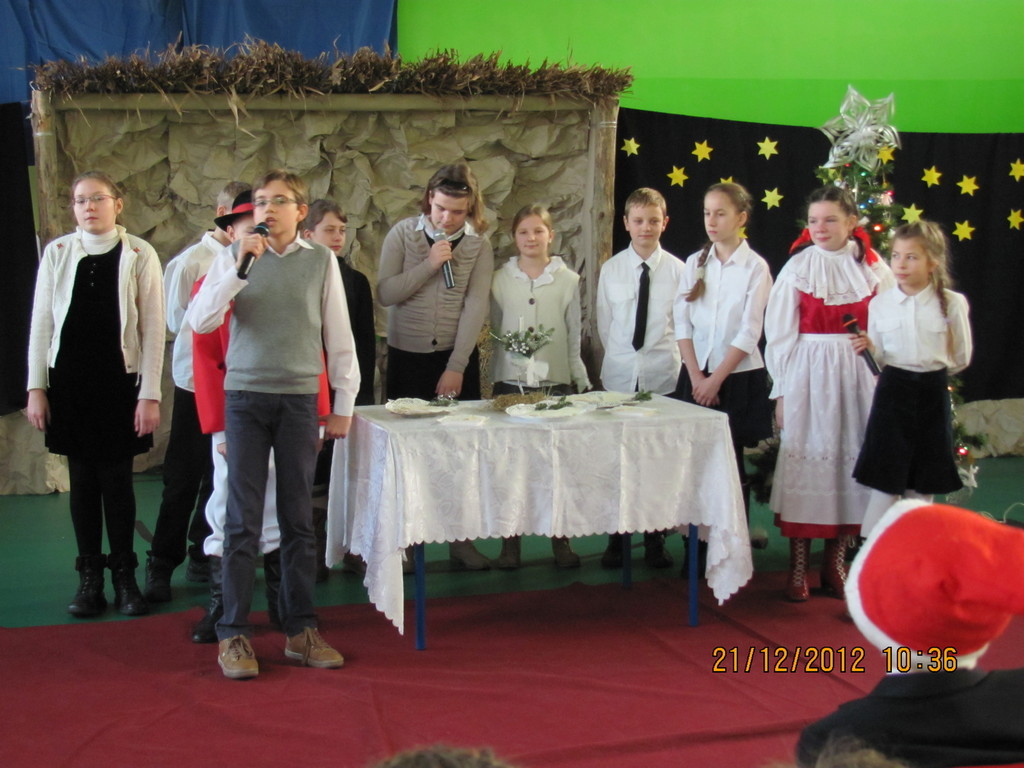 21 grudnia w naszej szkole dało się odczuć wyjątkowo świąteczną atmosferę która skłoniła nas do rozważań i przemyśleń dotyczących zbliżających się wielkimi krokami Świąt Narodzenia Pańskiego. Uczniowie, pod opieką p. Krystyny Grzemskiej przedstawili program o tematyce bożonarodzeniowej, zaprezentowany wcześniej, 6 grudnia, w Dobrzycy; w Oranżerii Zespołu Pałacowo-Parkowego. Wiersze i kolędy zostały zaprezentowane przez wychowanków zgromadzonych wokół tradycyjnie udekorowanego stołu oraz pięknie przystrojonej choinki. Całości dopełniała ogromna dekoracja przygotowana specjalnie na jasełka najmłodszych, które miały miejsce nieco wcześniej - 18 grudnia.