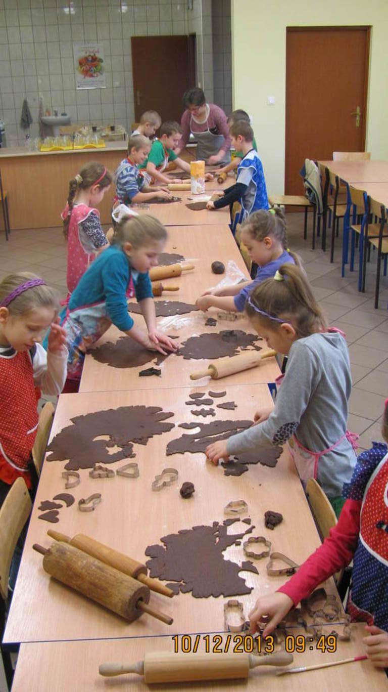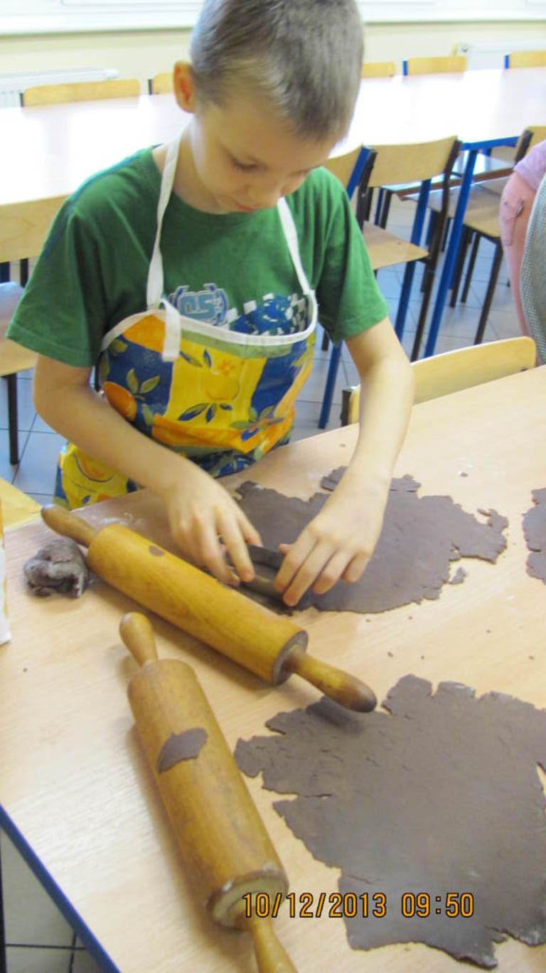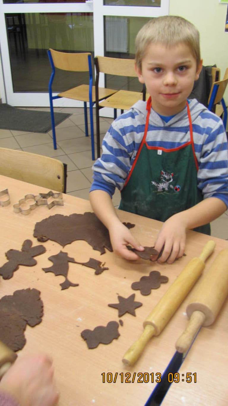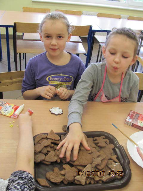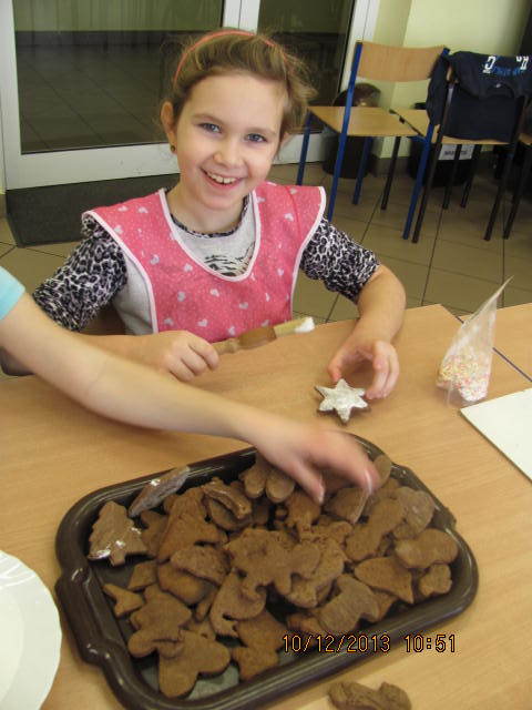 Dwa tygodnie przed Świętami Bożego Narodzenie w naszej szkole zapachniało piernikami. Dzieci z drugiej klasy razem z panią i mamą Eryka piekły świąteczne pierniki. Było wałkowanie, wycinanie, lepienie... Czekanie, żeby z piekarnika wydobyć już upieczone i piękne zdobienie kolorowymi lukrami i posypkami. Na koniec każdy pakował kilka swoich pierniczków, żeby zabrać je do domu, by i tam zaczęło pachnieć nadchodzącymi Świętami. Jednak większość schowaliśmy na Klasowe Święto Piernikowe.
