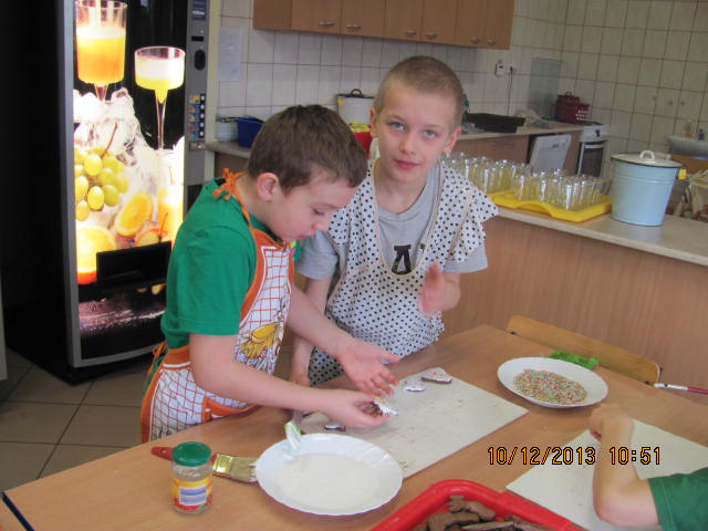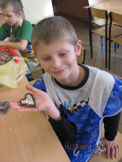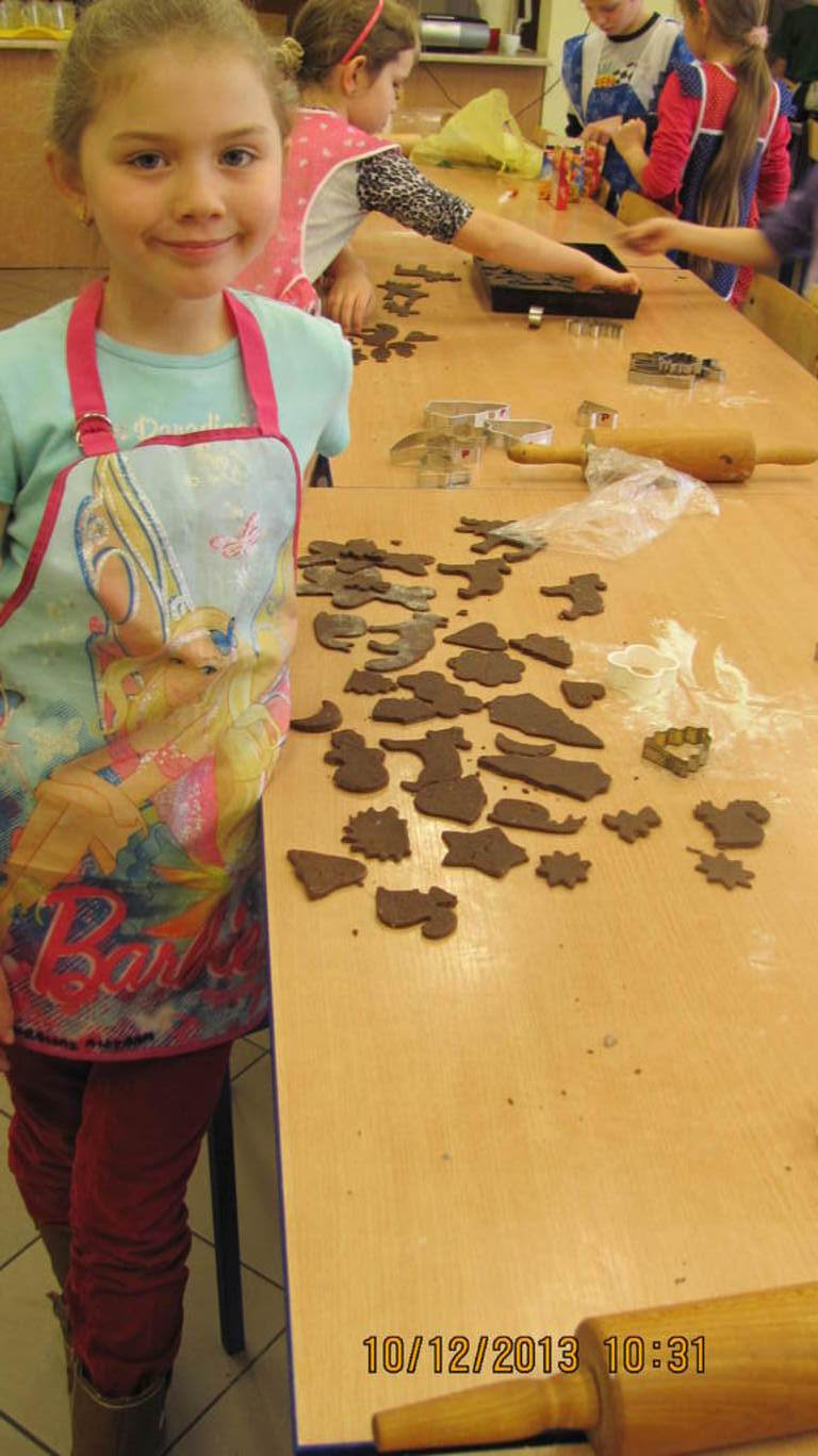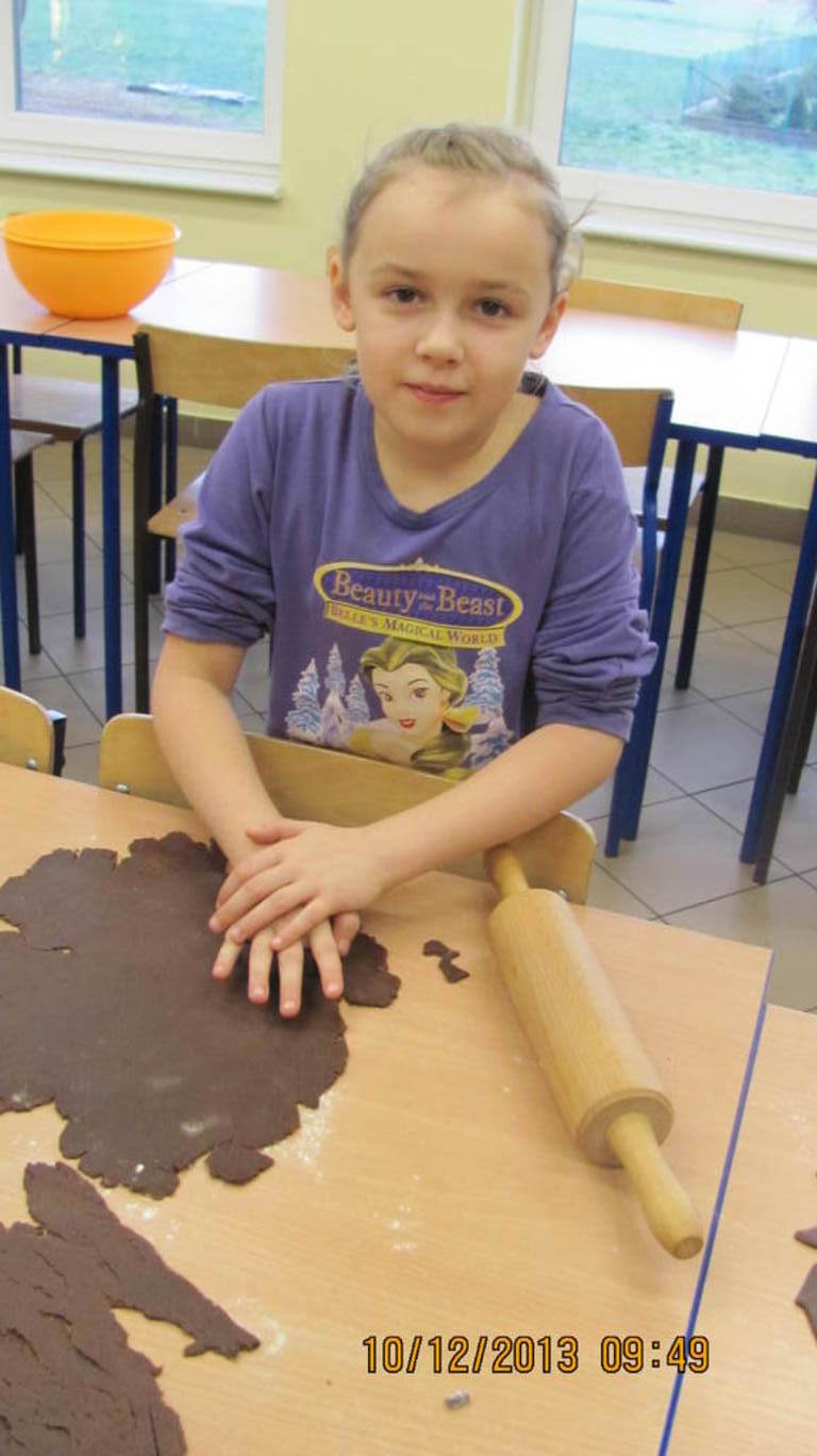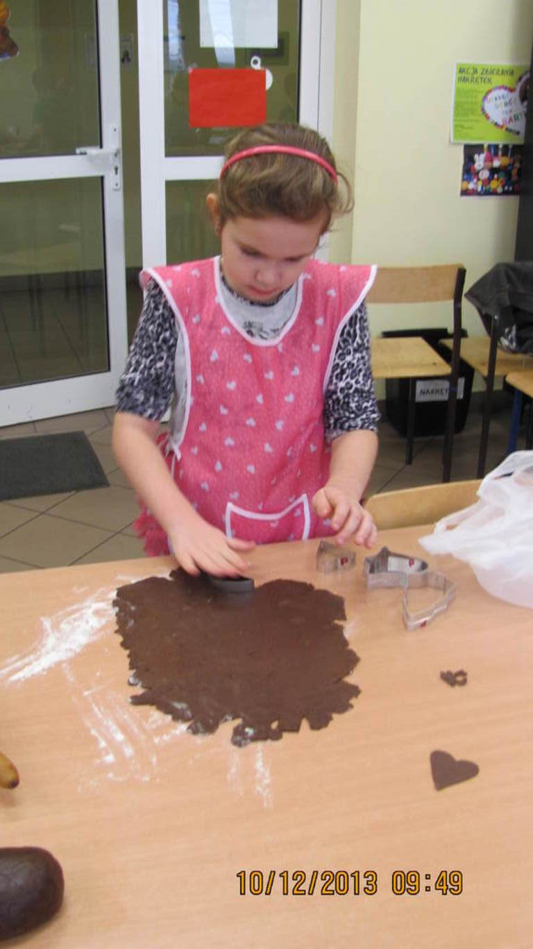 Dwa tygodnie przed Świętami Bożego Narodzenie w naszej szkole zapachniało piernikami. Dzieci z drugiej klasy razem z panią i mamą Eryka piekły świąteczne pierniki. Było wałkowanie, wycinanie, lepienie... Czekanie, żeby z piekarnika wydobyć już upieczone i piękne zdobienie kolorowymi lukrami i posypkami. Na koniec każdy pakował kilka swoich pierniczków, żeby zabrać je do domu, by i tam zaczęło pachnieć nadchodzącymi Świętami. Jednak większość schowaliśmy na Klasowe Święto Piernikowe.