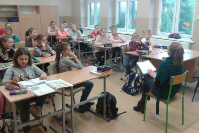 Pierwszaki na spotkaniu z babcią i dziadkiem